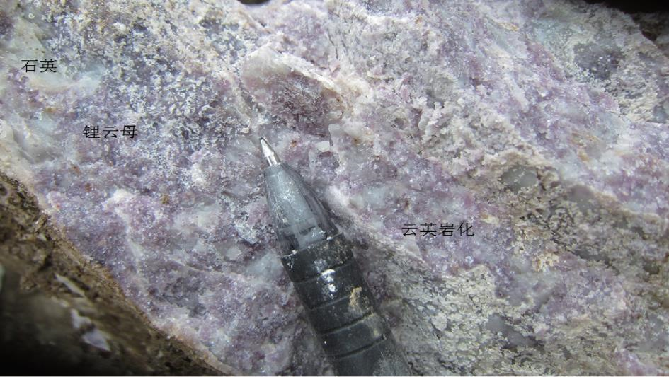 图14 浅紫红色锂云母与石英呈云英岩化
