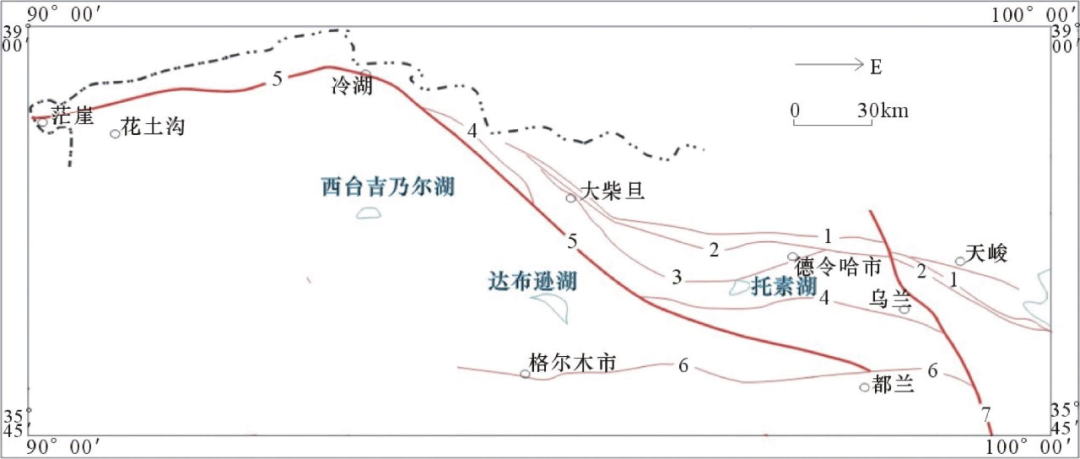 图1 柴北缘地区构造单元(a.Ⅱ级,b.Ⅲ级)划分图柴北缘断裂构造十分发育,一般密集成束分布,按其切割深度和地质意义可分为2大类:深断裂和地壳型断裂。断裂延伸方向主要为近东西向、北西西向和近南北向,主断裂带不仅控制地质构造和地层区划,而且对岩浆岩和矿产分布的控制作用明显,它们多具有切割深、延伸长和多期次活动之特点,具有构造分区界线的意义(图2)。最主要断裂带包括哇洪山-温泉断裂、宗务隆山-青海南山断裂、土尔根大阪-宗务隆山南缘断裂、丁字口(全吉山南缘)-乌兰断裂、赛什腾-旺尕秀断裂、柴北缘-夏日哈断裂等。总体上,北西向断裂和大型剪切带是侵入岩体的主要控岩构造,北西-近东西向次级褶皱和断裂裂隙构造控制着伟晶岩脉。图2 柴北缘地区区域断裂示意图