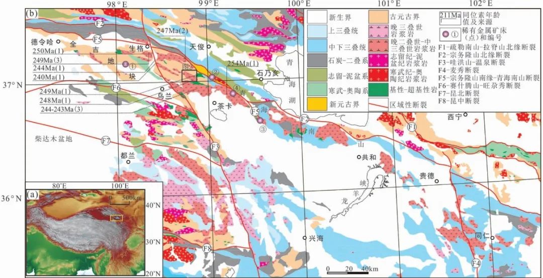 图0-1 青海南山-同仁地区地理位置(a)和地质矿产略图(b)(来源:王秉璋等,2023)稀有金属矿床(点):①沙柳泉铌钽矿;②茶卡北山锂铍矿;③石乃亥铌钽矿;④红岭北锂铍矿点