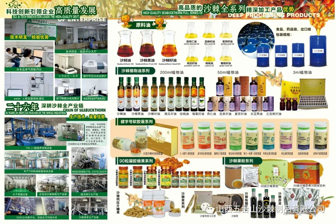 二十六年来,公司始终坚持科技创新引领企业高质量发展。累计投入2000余万元,成立了拥有1000多平米的山西五台山沙棘制品有限公司技术研发·检验中心,拥有万级无尘的微生物培养室、拥有Water's高效液相色谱仪、日本岛津气质联用仪等67台套高精度的分析仪器。巨额引进了700L×3二氧化碳超临界萃取设备、分子蒸馏设备、250型软胶囊及凝胶糖果生产线等国际国内先进的生产技术设备,自主研发形成了以数字化、智能化为支撑的七大核心技术工艺,真正做到了将沙棘果“吃干榨尽”。此外公司的小试、中试超临界萃取设备实现了自动化、数据化、可视化,可以为企事业单位,科研院所及大专院校提供服务。