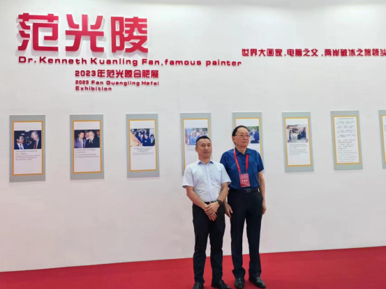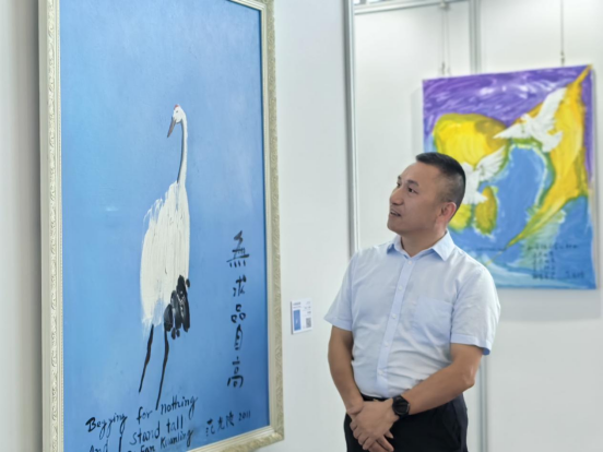 在中华电脑之父、诗人、书画家范光陵画展区,项五九和范老亲切攀谈并合影。在欣赏范老的诗意油画名作时,他说,一花一世界、一画一人生,范老在他的作品里多有体现“和平”“忠孝仁爱”的主旨,这是豪情大爱的体现,是用书画报效祖国、挥洒诗画人生的满满深情。