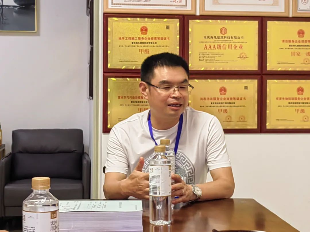 走访重庆海诗环保有限公司,公司负责人黄海龙向会长们介绍他们公司的经营情况。重庆海诗环保有限公司致力于环境安全,为学校、幼儿园开展消杀、除甲醛等服务,为学生们的身体健康保驾护航。特别是在疫情之间,重庆海诗环保有限公司免费为各大学校进行消杀。