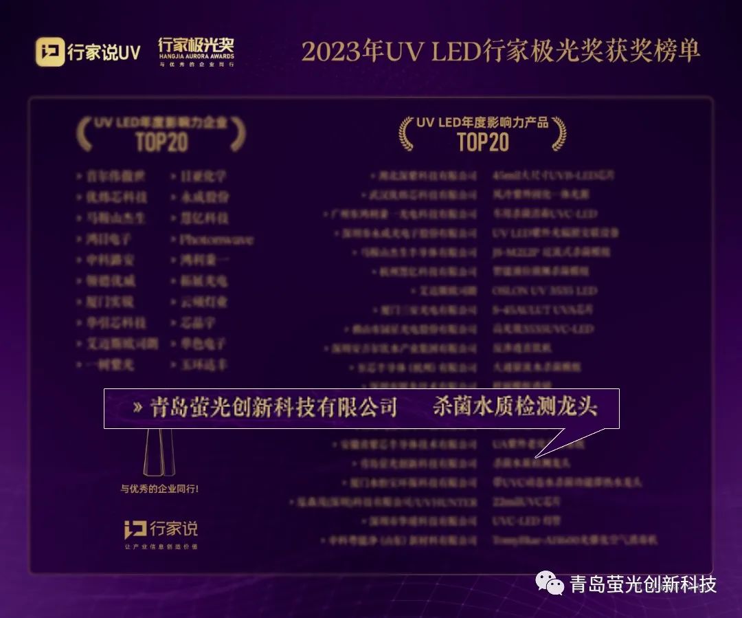 9月6日,2023年行家说——UV LED技术与产业应用高峰论坛暨极光奖榜单揭晓活动在深圳宝安国际会展中心举办。经 2023UV LED 行家极光奖组委会组织专家评审,青岛萤光荣获【2023UV LED 年度影响力产品 TOP20】奖项。
