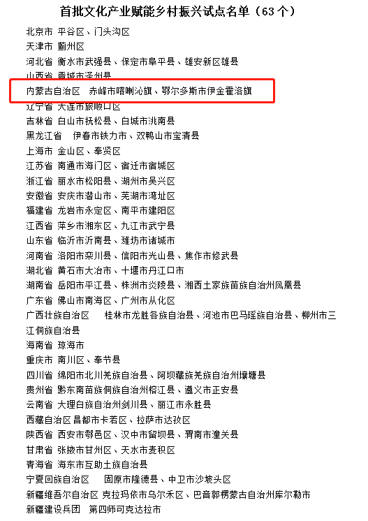 根据《关于开展文化产业赋能乡村振兴试点的通知》(办产业发〔2023〕8号),在各省级文化和旅游等部门推荐的基础上,经研究,文化和旅游部、教育部、自然资源部、农业农村部(国家乡村振兴局)拟确定首批63个文化产业赋能乡村振兴试点名单,现予以公示。