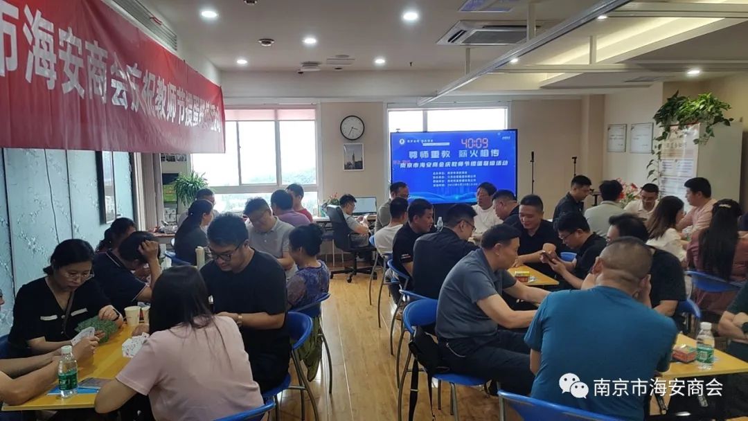 9月10日是第39个教师节,尊师重教,薪火相传。南京市海安商会举行庆祝教师节掼蛋联谊活动,大家其乐融融,畅叙乡情,度过了一个美好的有意义的教师节。参与活动的老师们纷纷表示:南京市海安商会在教师节当天举行这样的活动,特别有意义,彰显了商会尊师重道的人文关怀,表示由衷的感谢!筑梦金陵,情系海安。今后将以商会为平台和纽带,凝聚在南京的海安籍教师及其他乡友的智慧和力量,为建设南京、奉献海安做更多的实事。