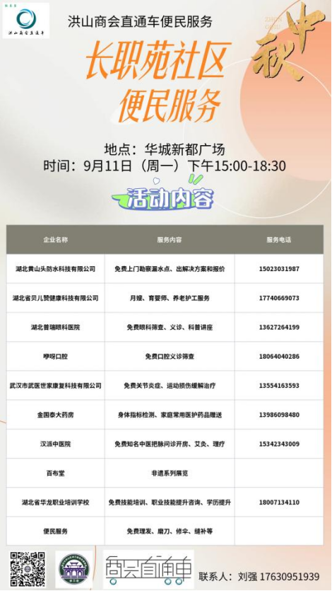 2023年9月11日,中秋佳节即将来临之际,洪山商会直通车携手多家企业,在长职苑社区开展了一场别开生面的便民服务活动。本次活动旨在关爱居民身心健康,改善居民生活环境,丰富居民精神生活,同时提高企业的知名度,促进企业的发展。