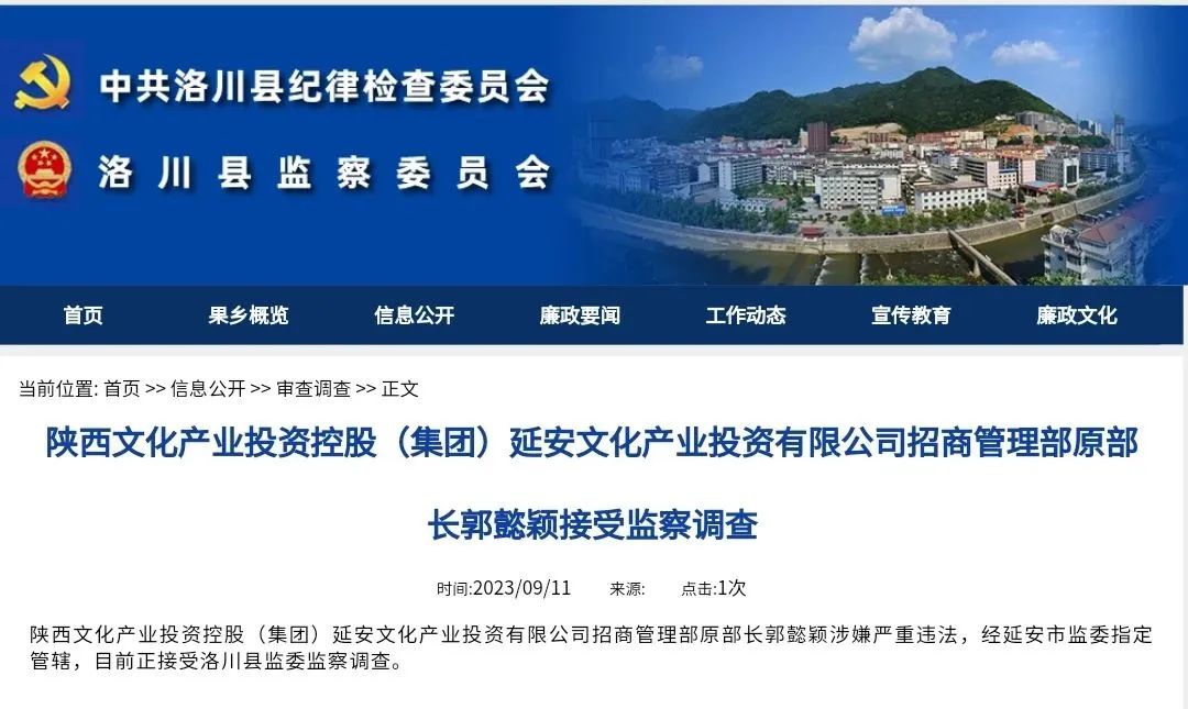 陕西文化产业投资控股(集团)延安文化产业投资有限公司招商管理部原部长郭懿颖涉嫌严重违法,经延安市监委指定管辖,目前正接受洛川县监委监察调查。