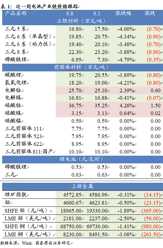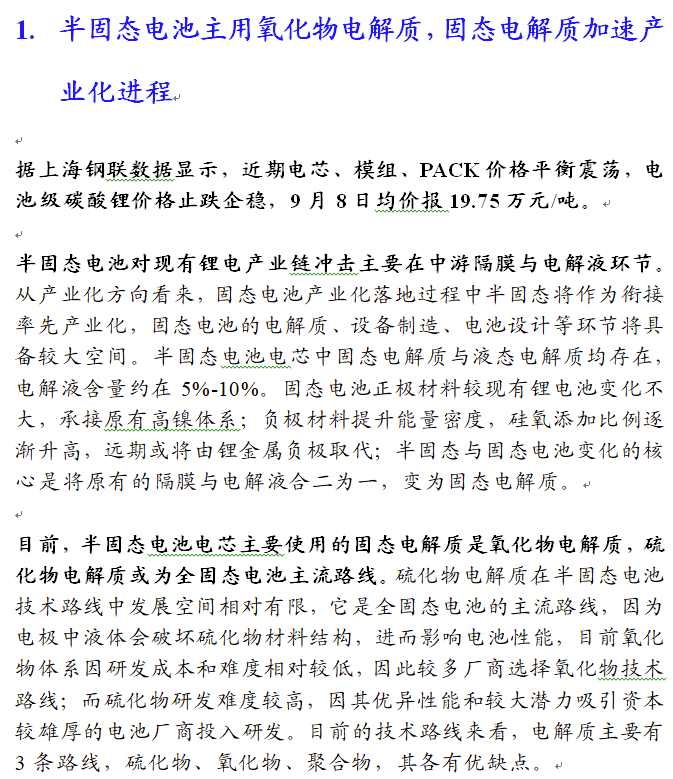 半固态电池对现有锂电产业链冲击主要在中游隔膜与电解液环节。固态电池产业化落地过程中半固态将作为衔接率先产业化,固态电池的电解质、设备制造、电池设计等环节将具备较大空间。半固态电池电芯中固态电解质与液态电解质均存在,电解液含量约在5%-10%。固态电池正极材料较现有锂电池变化不大,承接原有高镍体系;负极材料提升能量密度,硅氧添加比例逐渐升高,远期或将由锂金属负极取代;半固态与固态电池变化的核心是将原有的隔膜与电解液合二为一,变为固态电解质。