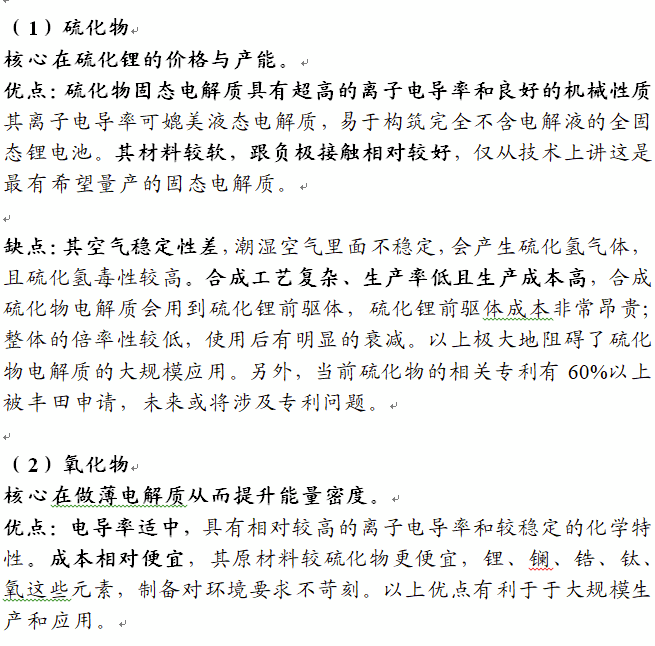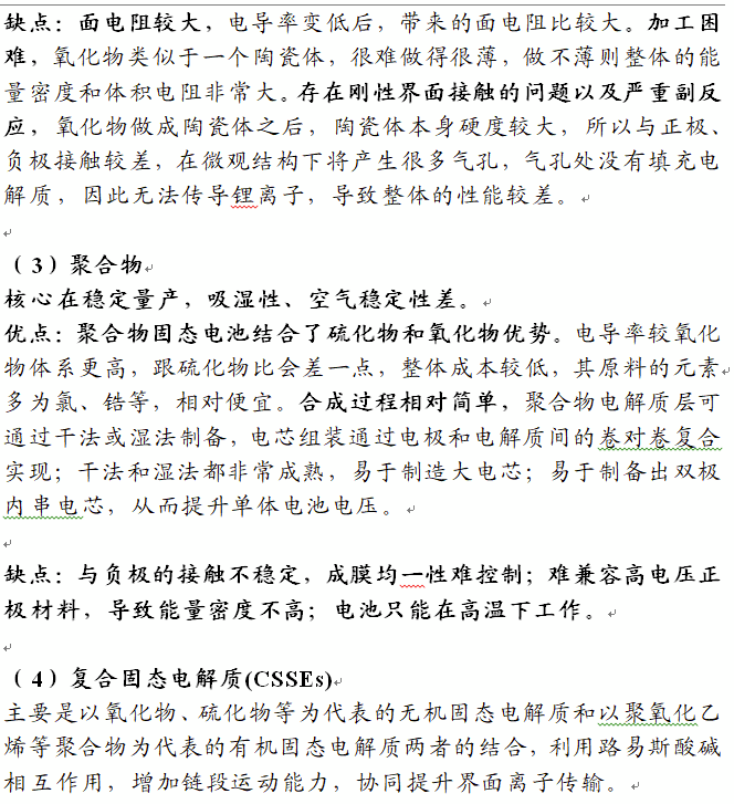 目前,半固态电池电芯主要使用的固态电解质是氧化物电解质,硫化物电解质或为全固态电池主流路线。硫化物电解质在半固态电池技术路线中发展空间相对有限,它是全固态电池的主流路线,因为电极中液体会破坏硫化物材料结构,进而影响电池性能,目前氧化物体系因研发成本和难度相对较低,因此较多厂商选择氧化物技术路线;而硫化物研发难度较高,因其优异性能和较大潜力吸引资本较雄厚的电池厂商投入研发。目前的技术路线来看,电解质主要有3条路线,硫化物、氧化物、聚合物,其各有优缺点。