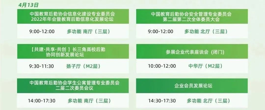 安全管理专业委员会第二节第二次全体会员大会、信息化建设专业会2022年年会暨教育后勤信息化发展论坛、学生公寓管理专业委员会二届二次委员会议、长三角学校后勤发展改革研讨会等论坛活动将于明日精彩上演。敬请莅临!