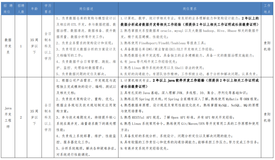 根据工作需要,贵州空港智能科技有限公司本次公开招聘工作人员共计3名,具体招聘岗位及要求详见《贵州空港智能科技有限公司2023年社会招聘岗位信息表》(附件1)。