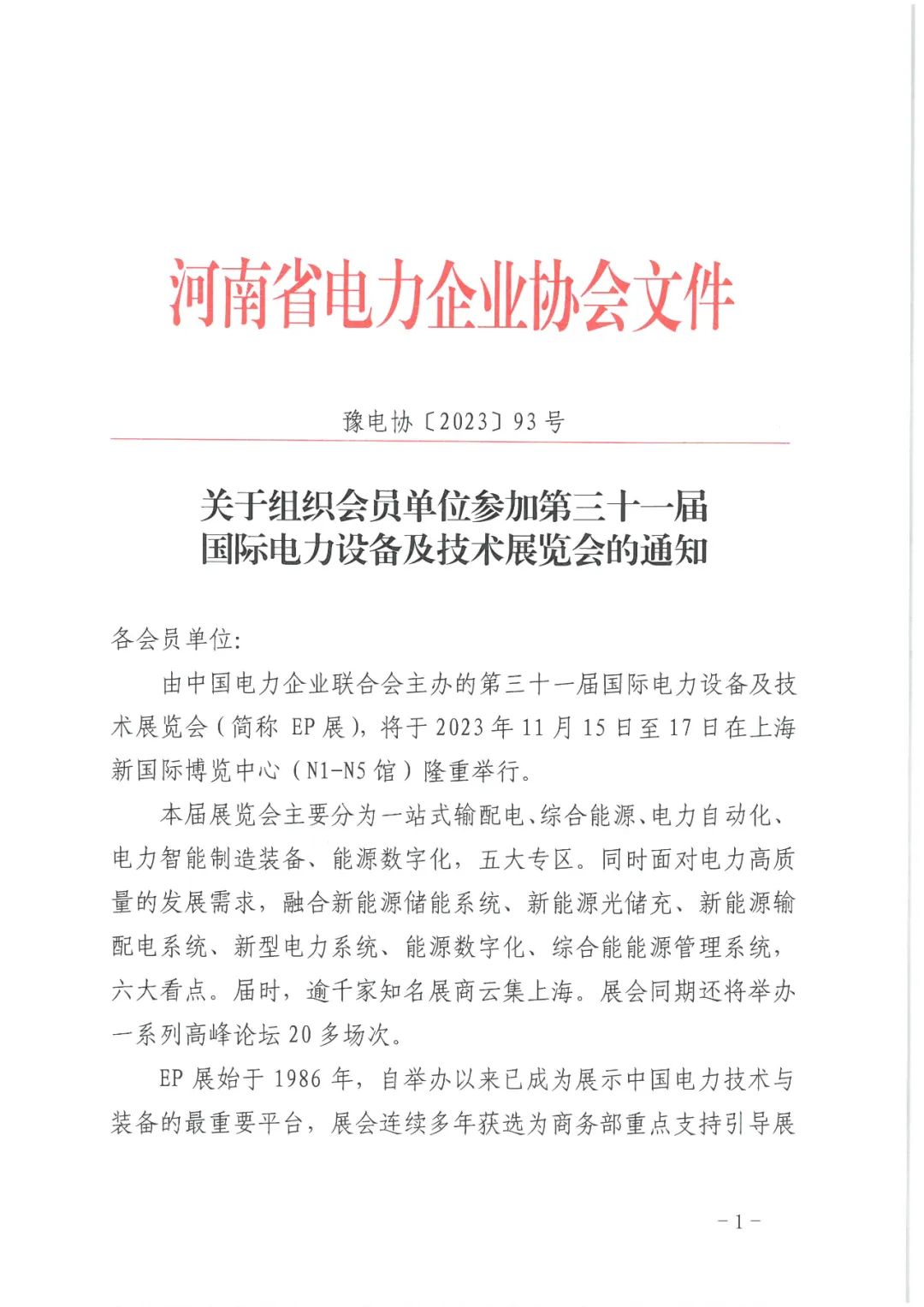 【展会通知】关于组织会员单位参加第三十一届国际电力设备及技术展览会的通知