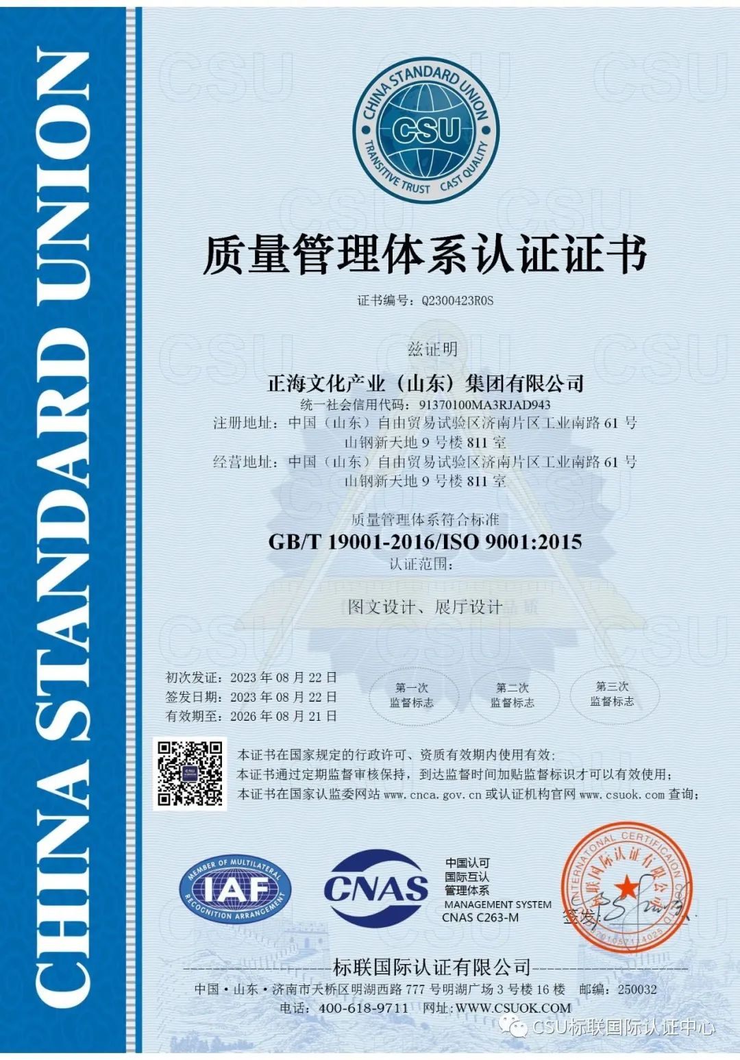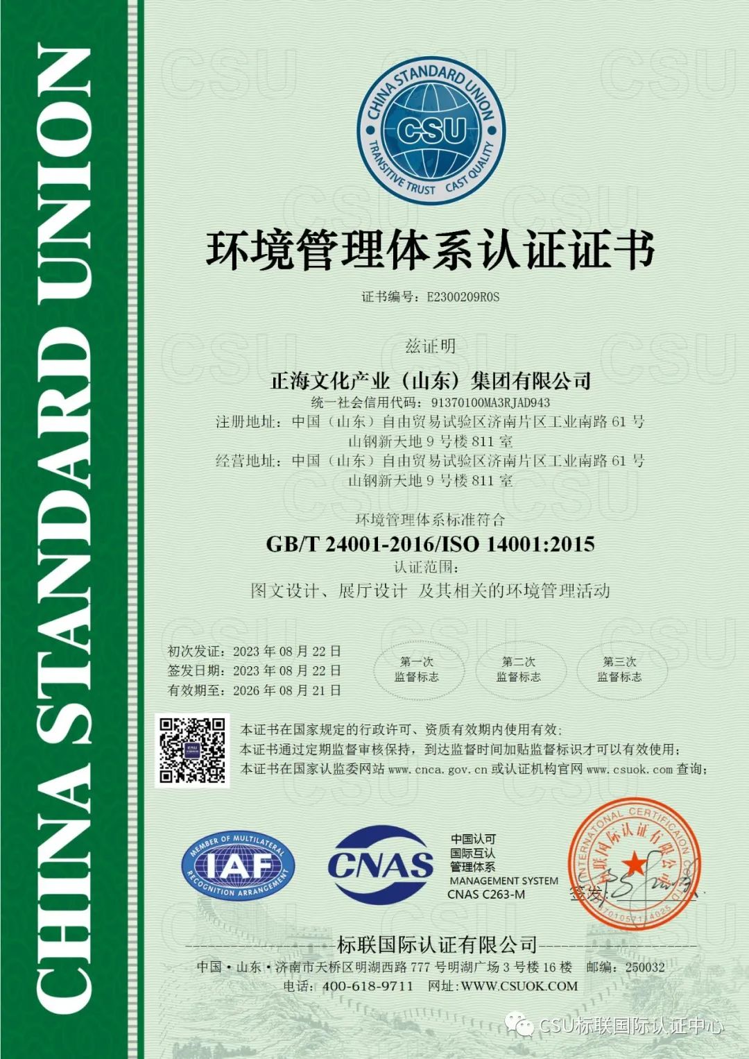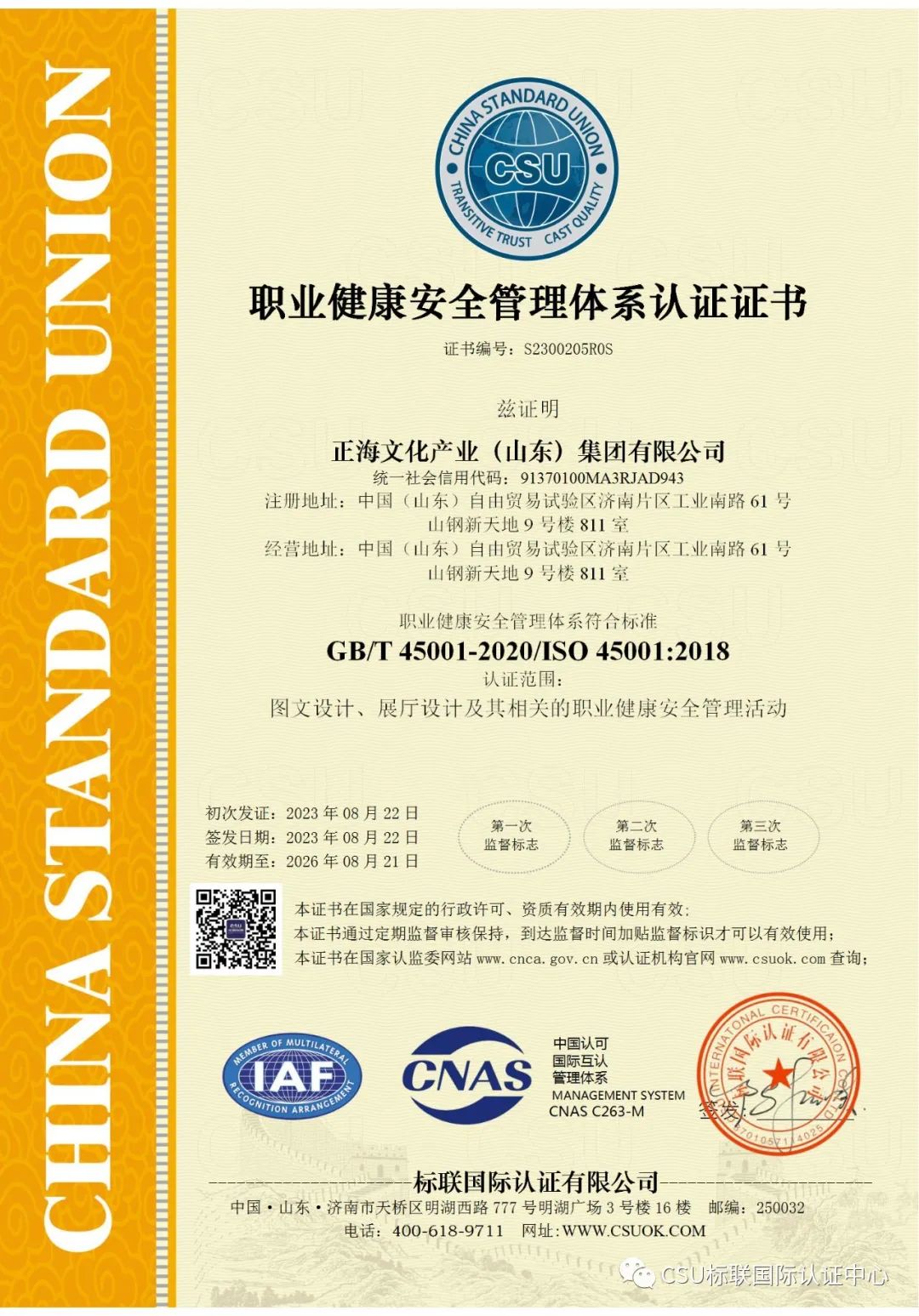 祝贺:正海文化产业(山东)集团有限公司获得三体系认证证书!