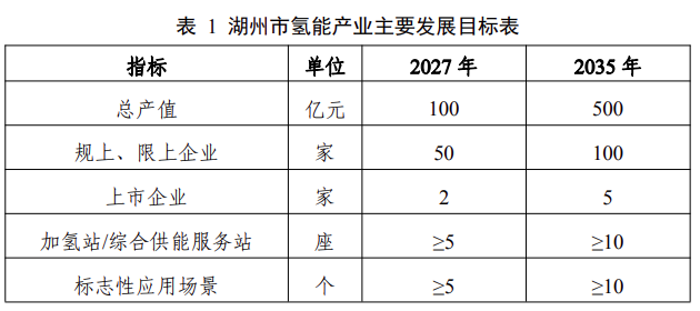 到2035年,集聚氢能产业领域规上、限上企业100家以上,培育上市企业5家以上,建成独立加氢站和综合供能服务站10座以上,打造具有示范协同效应的标志性氢能应用场景10个以上,氢能及相关产业年产值突破500亿元,推动湖州氢能产业具备全国乃至全球影响力。
