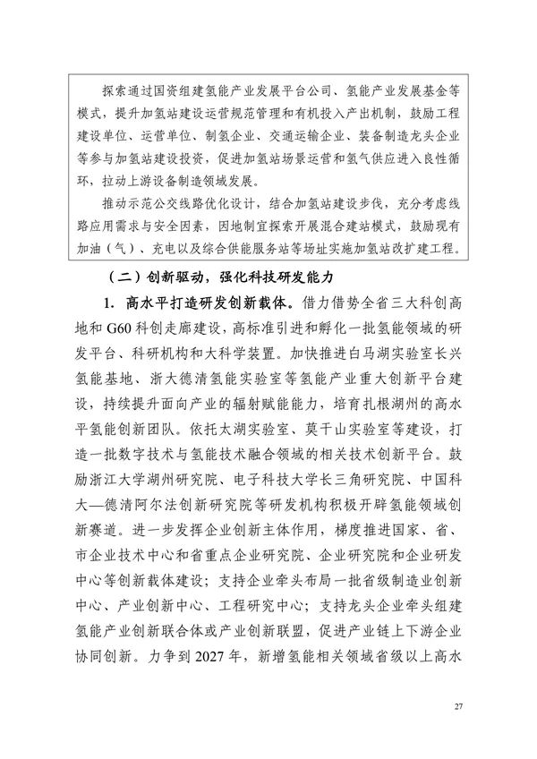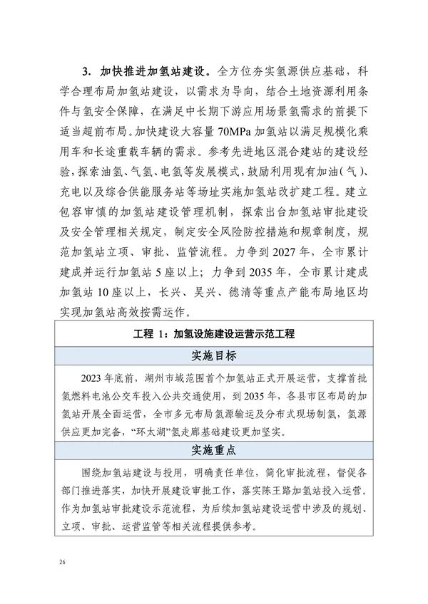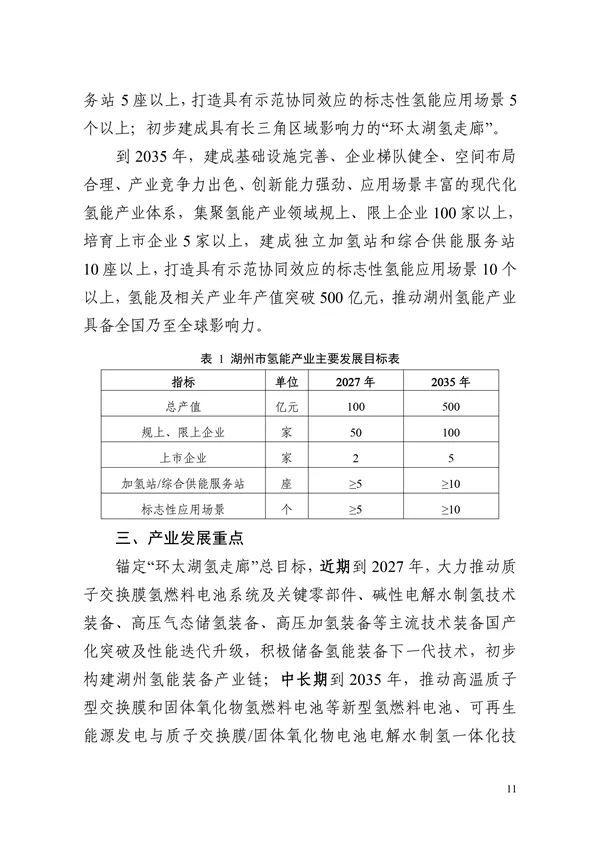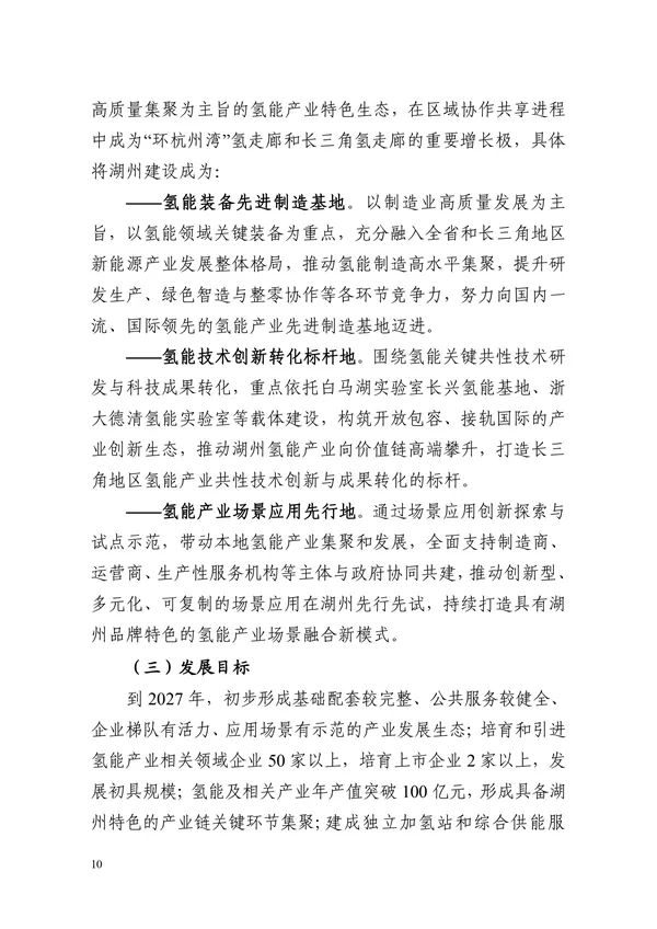 到2027年,培育和引进氢能产业相关领域企业50家以上,培育上市企业2家以上,氢能及相关产业年产值突破100亿元,形成具备湖州特色的产业链关键环节集聚;建成独立加氢站和综合供能服务站5座以上,打造具有示范协同效应的标志性氢能应用场景5个以上;初步建成具有长三角区域影响力的“环太湖氢走廊”。