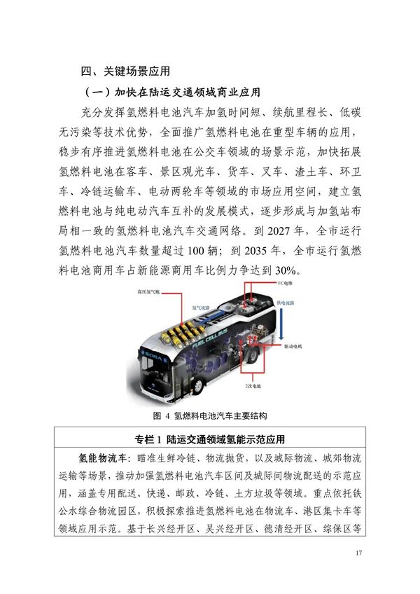 到2027年,氢燃料电池车在港口集卡中的比例达到50%;到2035年,氢燃料电池车在港口集卡中的比例达到80%。在太湖旅游度假区、太湖龙之梦乐园、余村“两山”景区等区域,构建1-2 条氢燃料电池观光车示范线,力争到2027年,应用推广氢燃料电池观光车10辆以上;到2035年,应用推广氢燃料电池观光车30辆以上。到2027年,在长兴、吴兴、德清、南太湖新区等区域构建2-3条氢燃料电池公交车示范线;依托长兴经开区、德清地理信息小镇等市内园区平台,构建一批园区通勤氢燃料电池客车试点线。