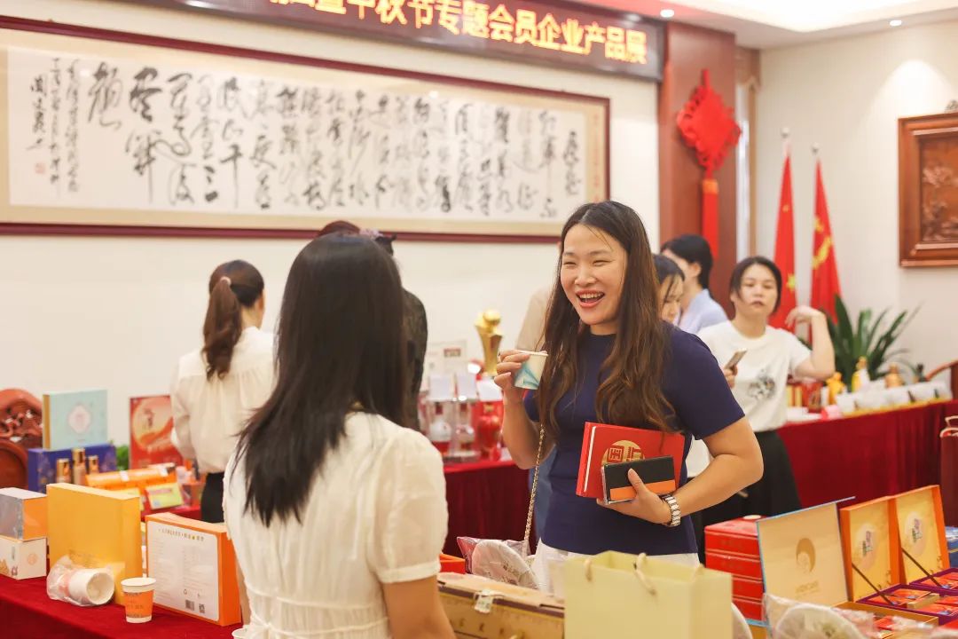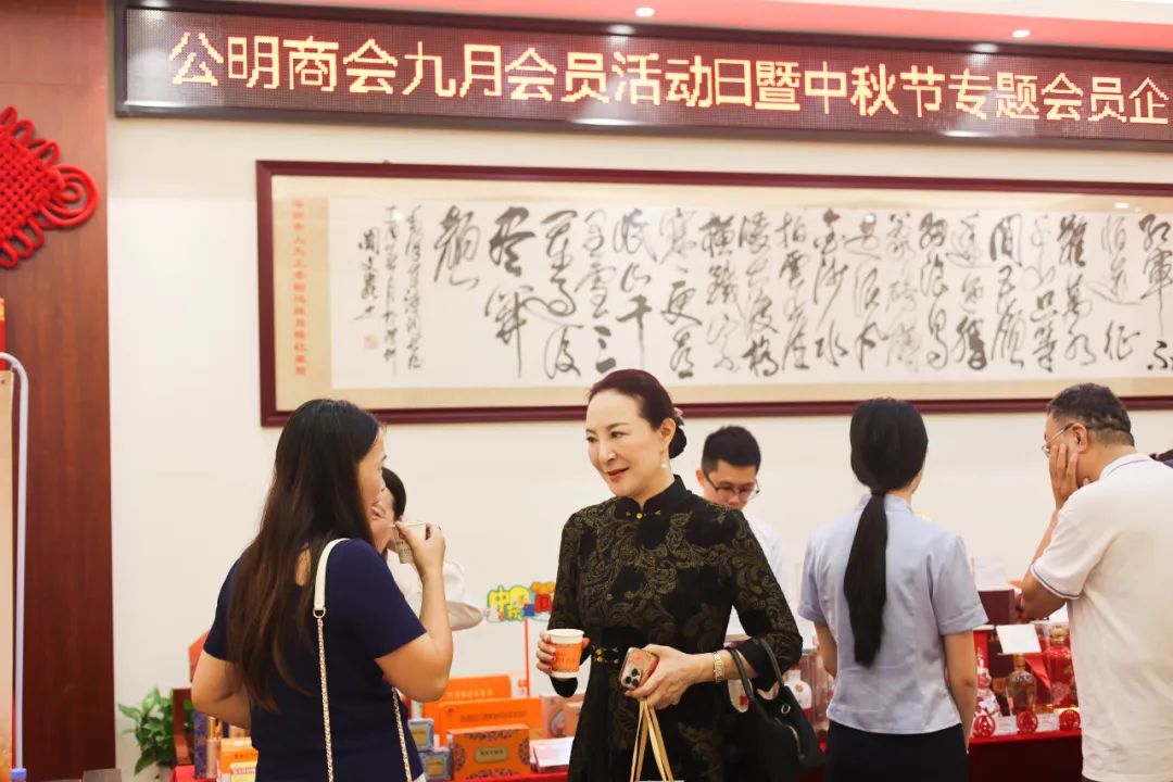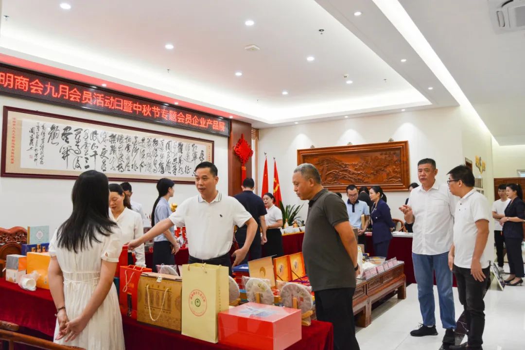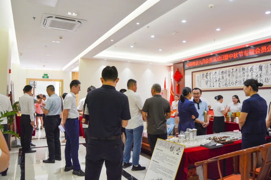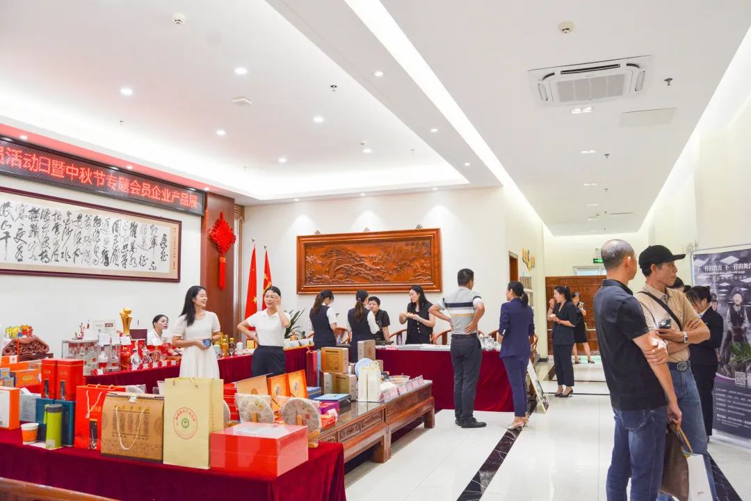 本次会员活动日中,特别开展“匠心礼遇、共享团圆”中秋节专题会员企业产品展。现场陈设展位与易拉宝,集中展销品牌月饼、优质茶酒、滋补佳品、休闲食品等产品,精美多样、品质上乘。来往的会员企业家们纷纷驻足欣赏体验产品,认真聆听专人讲解,一同交流洽谈。