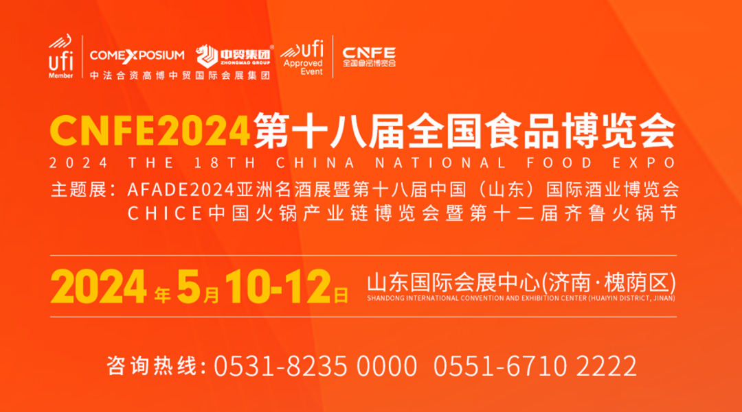 CNFE2024第十八届全国食品博览会将于2024年5月10日-12日在济南市山东国际会展中心(槐荫区)盛大举办。【主题展:AFADE2024亚洲名酒展暨第十八届中国(山东)国际酒业博览会、CHICE2024中国火锅产业链博览会暨第十二届齐鲁火锅节】