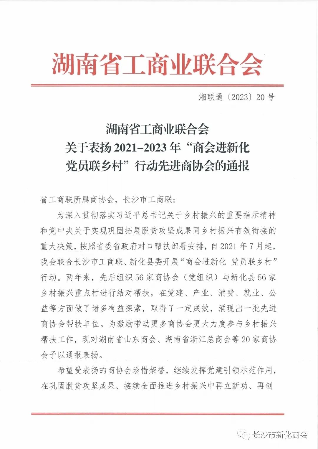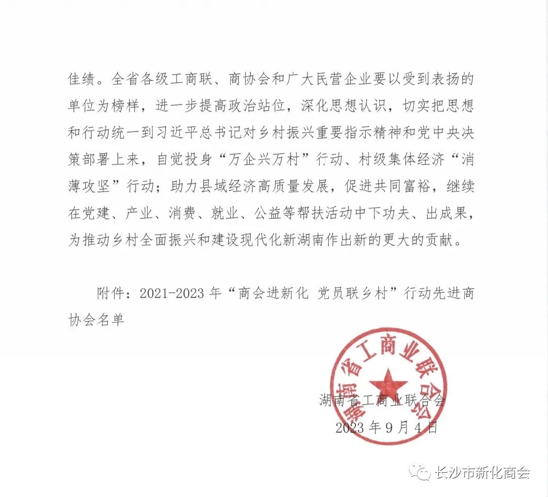 今天,全省“万企兴万村”行动现场推进会暨民营企业助力县域经济发展活动走进溆浦。会上,宣读了《关于表扬2021-2023年“商会进新化党员联乡村”行动先进商协会的通报》,长沙市新化商会荣获“万企兴万村”先进商会荣誉称号!