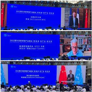 ▲联合国驻华协调员常启德(Siddharth Chatterjee)、能源转型委员会(ETC)主席阿代尔(Adair-Turner)、法国驻华大使罗梁(H.E.LaurentBili)视频致辞
