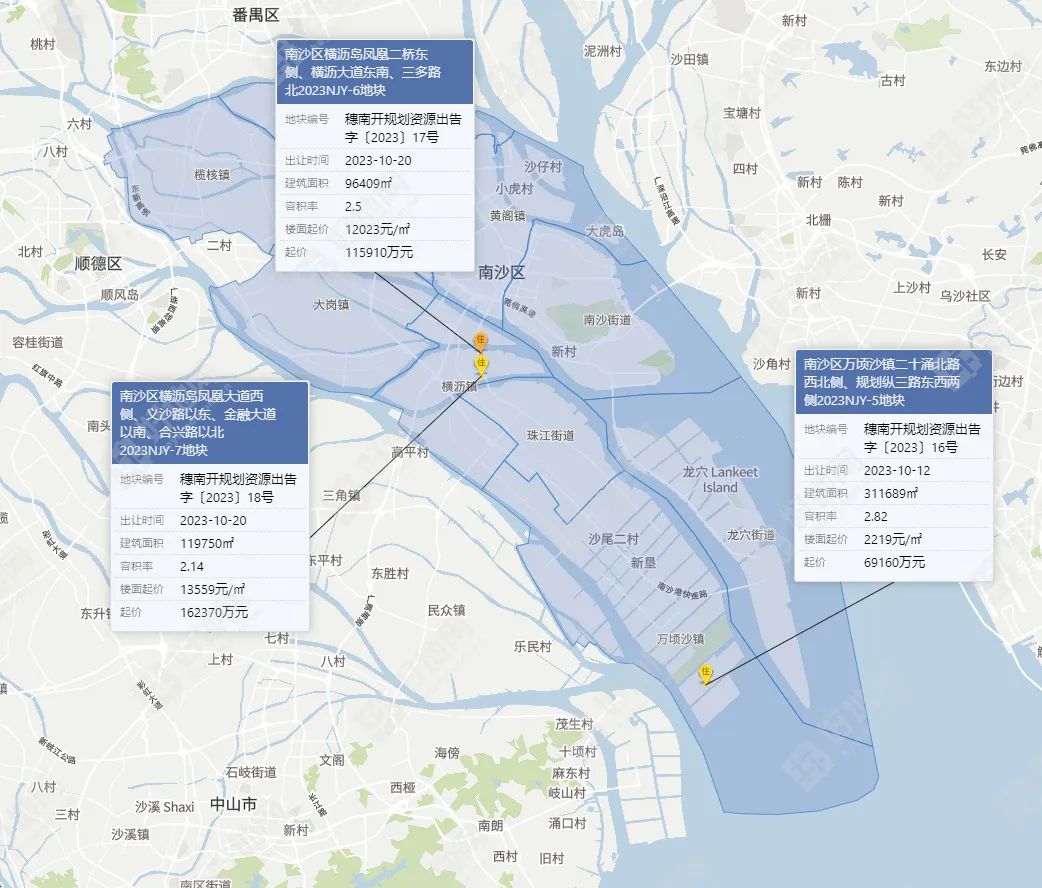 而上周南沙有3宗地挂牌拍卖,分布于万顷沙(1宗)与横沥岛(2宗),总出让面积20.5万方,总建筑面积52.8万方,总起价34.7亿元,已经看到有控制价格的趋势了,其中万顷沙20涌靠近连接深中通道的地块,楼面价上限楼面价2552元/㎡;位于核心区横沥金融岛的另外两块地,上限楼面价15000元/㎡左右。具体内容详见->南沙一口气挂牌3宗宅地!