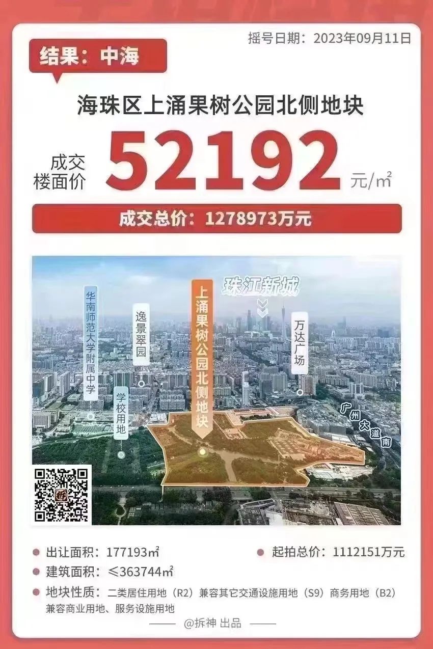 昨天9月11日海珠区上涌果树公园土拍摇号,楼面成交价5.2万了!