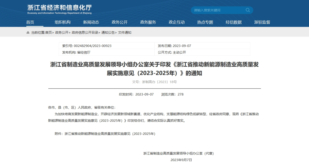 9月7日,浙江省经信厅发布浙江省制造业高质量发展领导小组办公室关于印发《浙江省推动新能源制造业高质量发展实施意见(2023-2025年)》(以下简称《实施意见》)的通知。