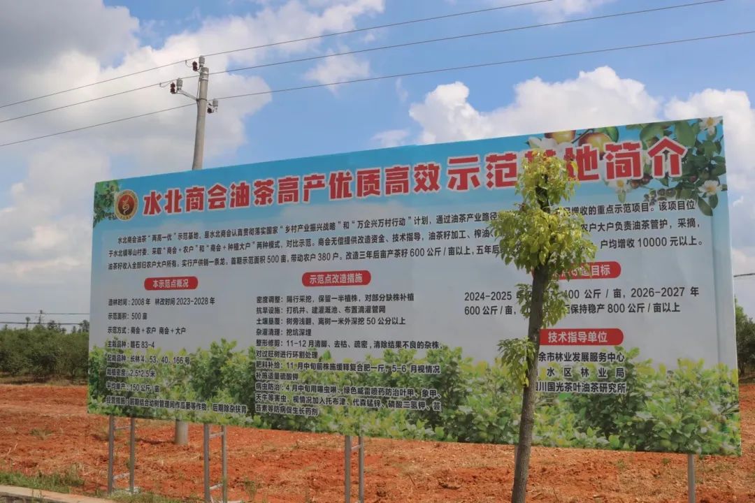 “我们将在基地实行密度调整、抗旱设施、土壤垦覆、杂灌清理、修行剪枝等等措施进行林改。”水北商会工作人员向我们介绍道,“基地首期示范面积 500 亩,改造三年后亩产茶籽 600公斤/亩以上,五年后稳定在 800 公斤/亩以上,户均增收10000元以上,让小小的茶树真正成为380名农户发家致富的‘摇钱树’。”