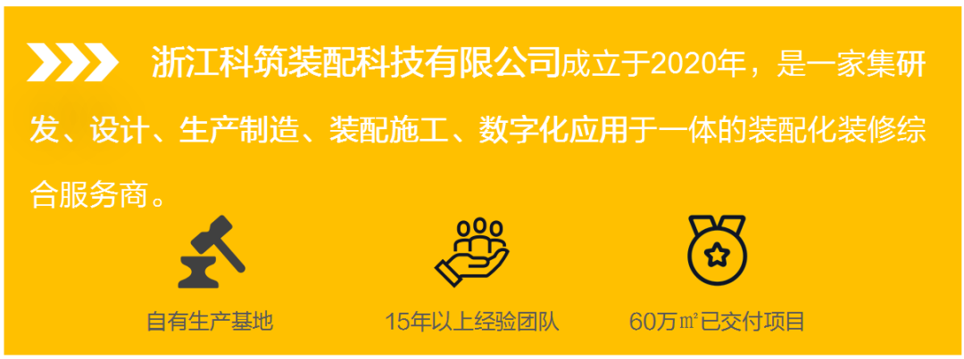 浙江科筑装配科技有限公司成立于2020年,是一家集研发、设计、生产制造、装配施工、数字化应用于一体的装配化装修综合服务商。