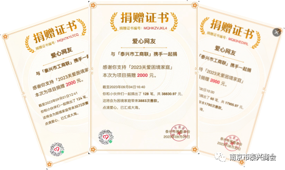 泰兴市工商联自8月27日发出“爱心济困·善行江苏”2023年江苏慈善专场活动倡议后,南京市泰兴商会积极响应,截止9月1日共有18名会员和在宁泰兴籍爱心人士参与捐赠(捐赠企业或个人已通报)。