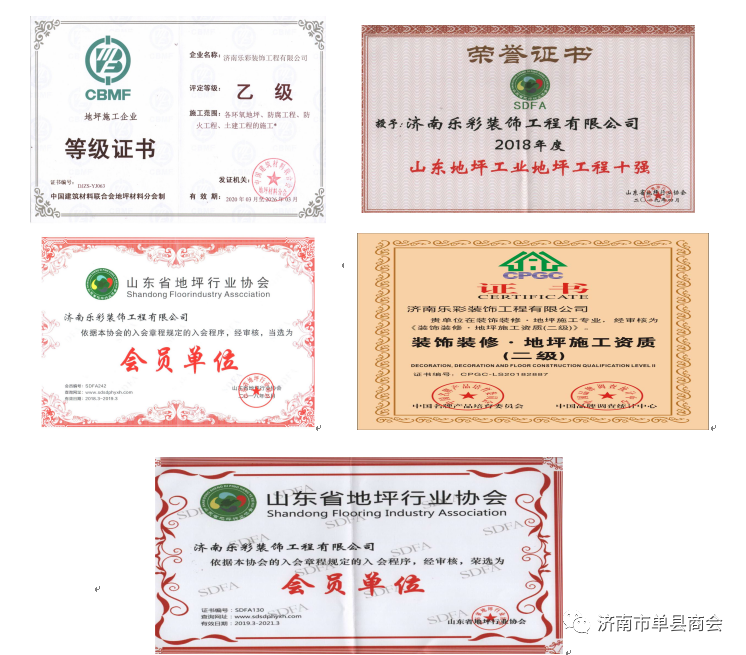 济南乐彩装饰工程有限公司成立于2015年11月26日,是一家专业环氧树脂地坪材料销售、工业地坪安装施工、旧地坪维修翻新为主的企业,企业注册资本100万元整,主要经营范围是建筑装饰装修工程、建筑幕墙工程、防水保温工程、楼宇智能化工程、防腐保温工程、管道工程(不含压力管、道)、地坪工程、建筑劳务分包(以上凭资质证经营);金属构件的安装;地坪技术服务;工程监理咨询:建筑工程技术咨询、技术服务;装饰装修材料的批发、零售。荣获多项奖项及证书。