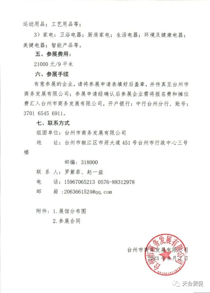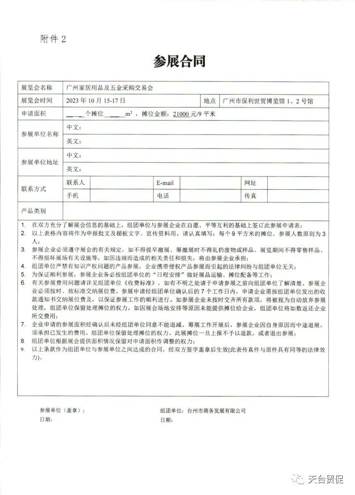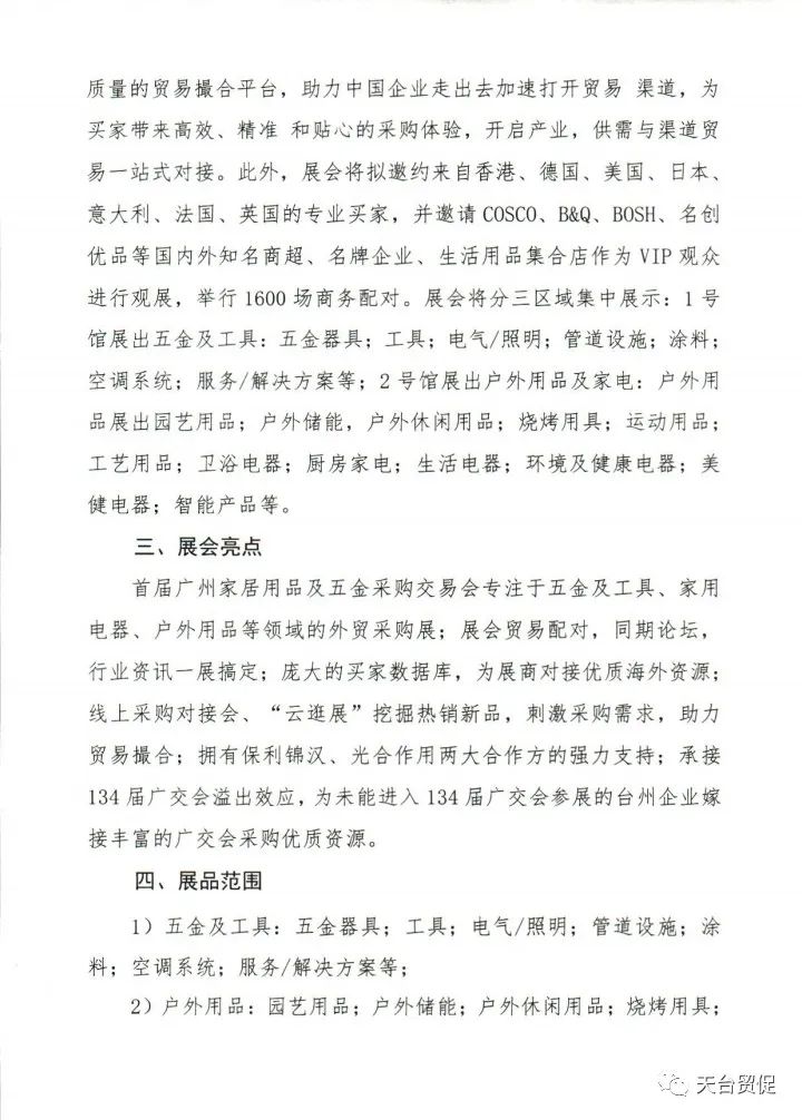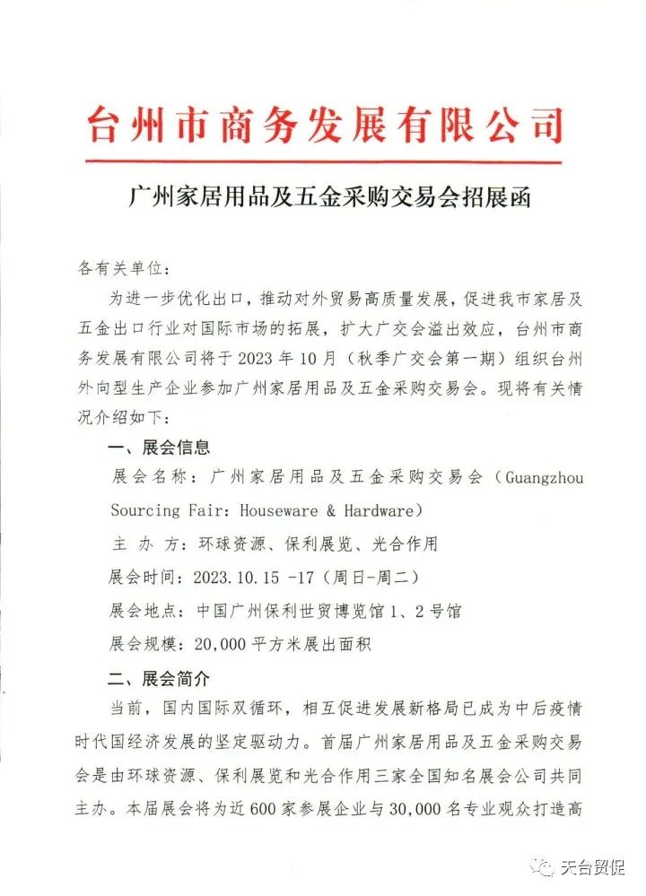为促进我市家居及五金出口行业对国际市场的拓展,扩大广交会溢出效应,台州市商务发展有限公司将于2023年10月组织台州外向型生产企业参加广州家居用品及五金采购交易会,现在有优惠,15号前上报一个展位减5000元(限前20个展位),20号前一个展位减3000元。具体事项如下: