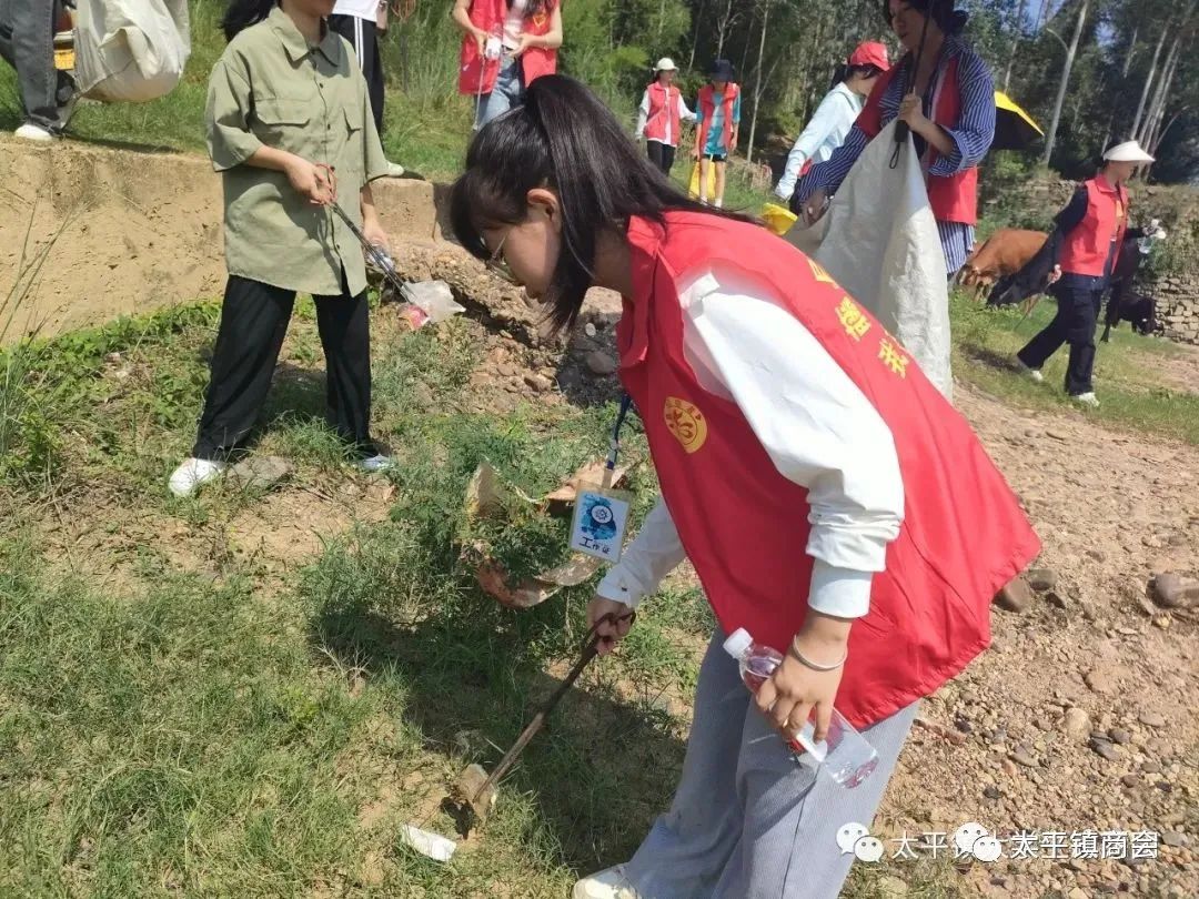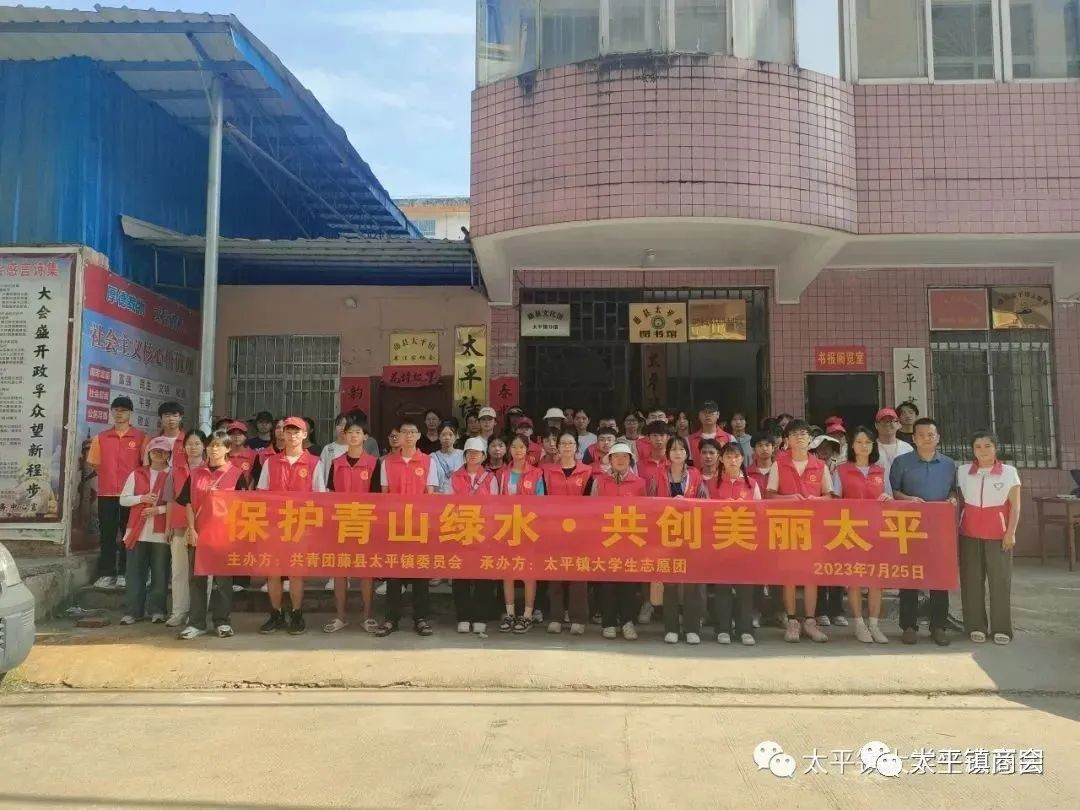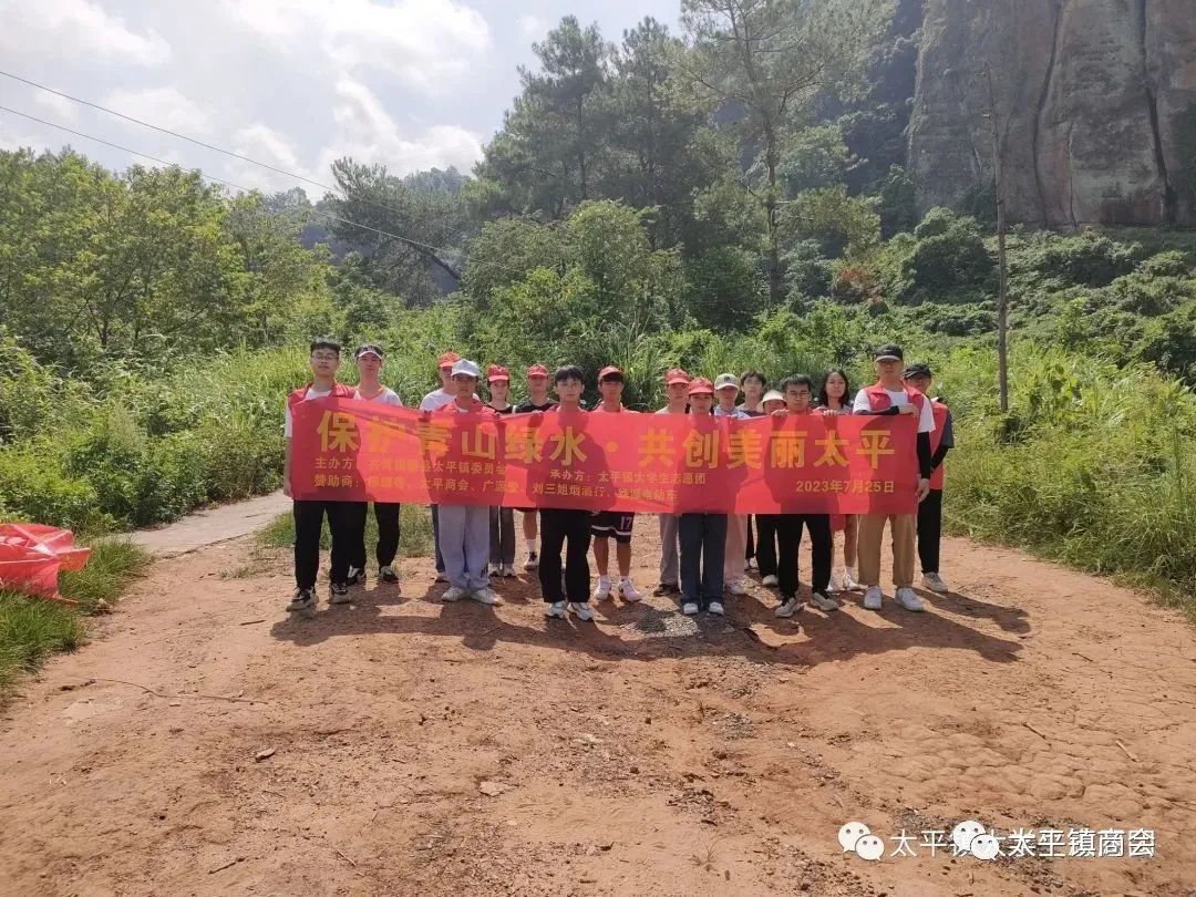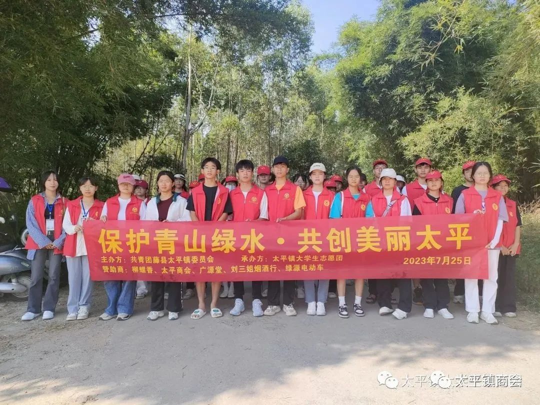 7月25日,在太平镇商会及会员企业柳螺香、广源堂药店、绿源电动车、刘三姐烟酒商行的支持下,太平镇大学生志愿团组织志愿者们开展了暑假的“青山绿水”活动,共有七十余名志愿者参加了本次清扫活动,主要负责清理狮山、大楼江、白运村及其周边的垃圾。