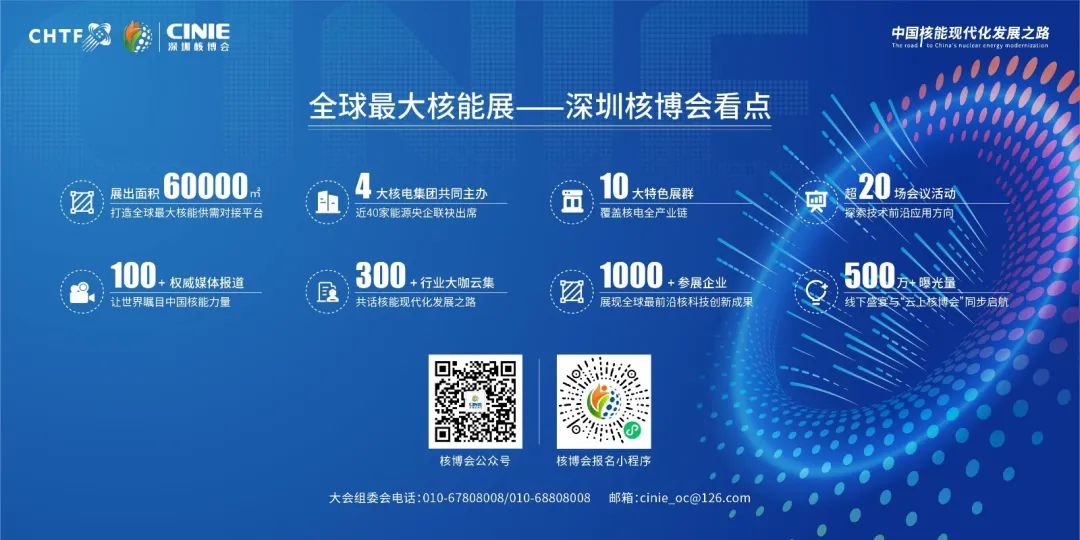 中国核能高质量发展大会暨深圳国际核能产业创新博览会(简称“深圳核博会”)将于11月15-18日在深圳国际会展中心举办。大会由中国能源研究会、中国广核集团有限公司、深圳市发展和改革委员会共同主办,中核集团、中国华能、中国大唐、国家电投、国家能源集团联合主办,主题为“核聚湾区·能动世界”。