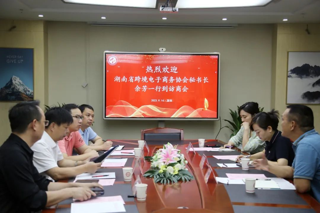 9月14日上午,湖南省跨境电子商务协会秘书长余芳、长沙市商务局法规处副处长李球明、长沙雨花经开区经济合作局负责人贺萃到访我商会参观交流,受到我商会秘书长李永平、副会长陈兆华、会员姚红及秘书处工作人员的热情接待!并于商会会议室座谈。会上,我商会李永平秘书长对余芳秘书长一行的到来表示热烈欢迎!并对商会第十届换届以来的工作开展情况及参会的会员企业家作了简要介绍,他表示:商会要服务会员,助推会员企业的高质量发展,并且商会在今后的发展中也会有成熟、稳定的招商团队,帮助家乡的招商引资、对接资源,服务家乡的产业转移相关工程。最后,李秘书长希望今后双方要进一步加强交流合作,发挥各自商协会的特点和优势,努力为会员企业创造更多交流合作的机会,努力为会员企业发展提供更好的服务,共同为建设家乡尽一份心、出一份力!湖南省跨境电子商务协会秘书长余芳座谈中向参会人员介绍了协会的发展历程以及经营范围,湖南省跨境电子商务协会于2017成立,协会目前已有300多家会员单位加入,在跨境电商领域有丰富的贸易产业。近年来,跨境电商产业迅猛发展,湖南也迎来了跨境电商发展的黄金时期,协会将充分发挥纽带和桥梁作用,积极参与推动湖南跨境电商产业发展,余芳秘书长表示,今天的会议非常有意义、有成效,是商协会之间友好往来的重要突破,希望能够与深圳市湖南商会合作开展跨境电商企业孵化、人才培训、项目对接等服务。