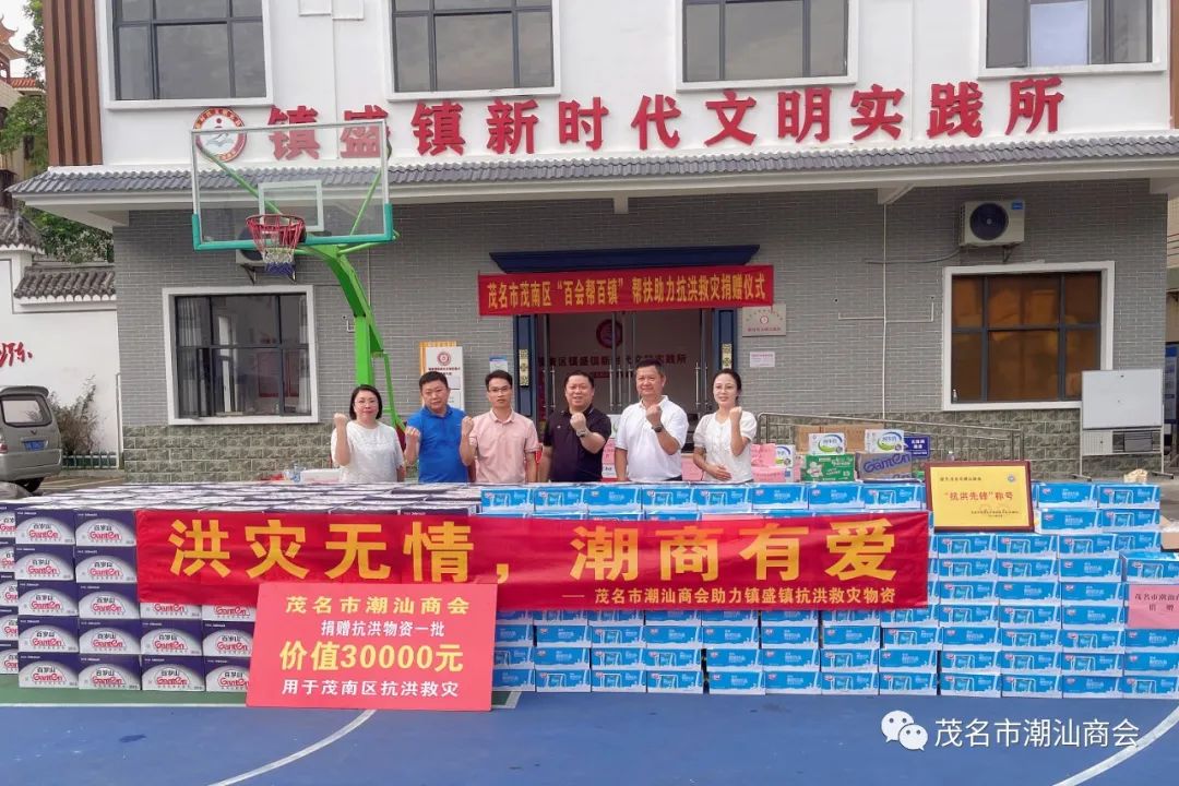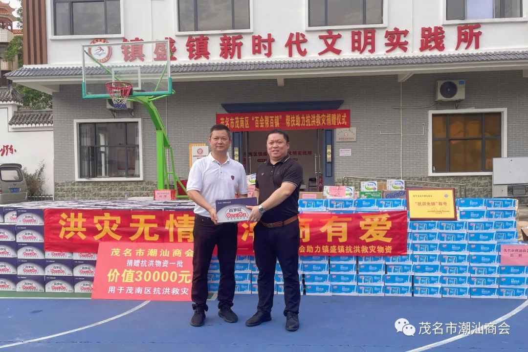 洪灾无情,潮商有爱。9月13日下午,茂名市茂南区“百会帮百镇”帮扶助力抗洪救灾捐赠仪式在镇盛镇政府顺利举行。区委常委、统战部部长李成波出席活动并讲话。受赖少伟会长委托,我会副会长陈锡茂等人代表商会送来了牛奶、矿泉水等价值3万多元的慰问物资。