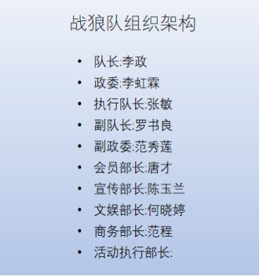 本次会议的主要议题是:对上半年工作进行总结,对下半年的工作开展部署,以及年会的筹备、会费催缴和战狼队组织班子的调整。队长李政首先对战狼队上半年的工作进行总结,并就下半年的工作计划进行安排和部署。在他的提议下,经大家一致表决同意,选出了战狼队新的管理团队班子(名单附后)。李队长希望与新的团队一起把本支队建设成不一样的”狼”队。最后他表示,大家要用好商会平台,组织各方资源,尽最大可能抱团取暖,共谋发展。