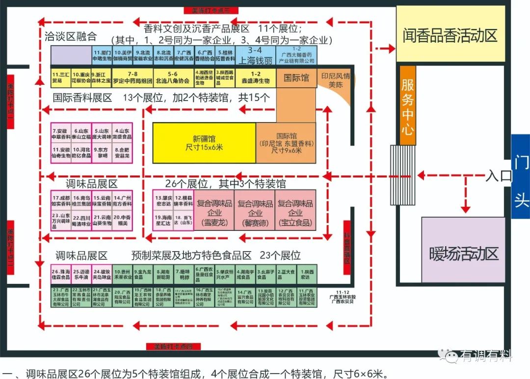 (2)室内:调味原料和复合调味料展区。各种调料原料、烹饪调料、烧烤调料、火锅底料、汤品调料、卤料、预制菜调料等。