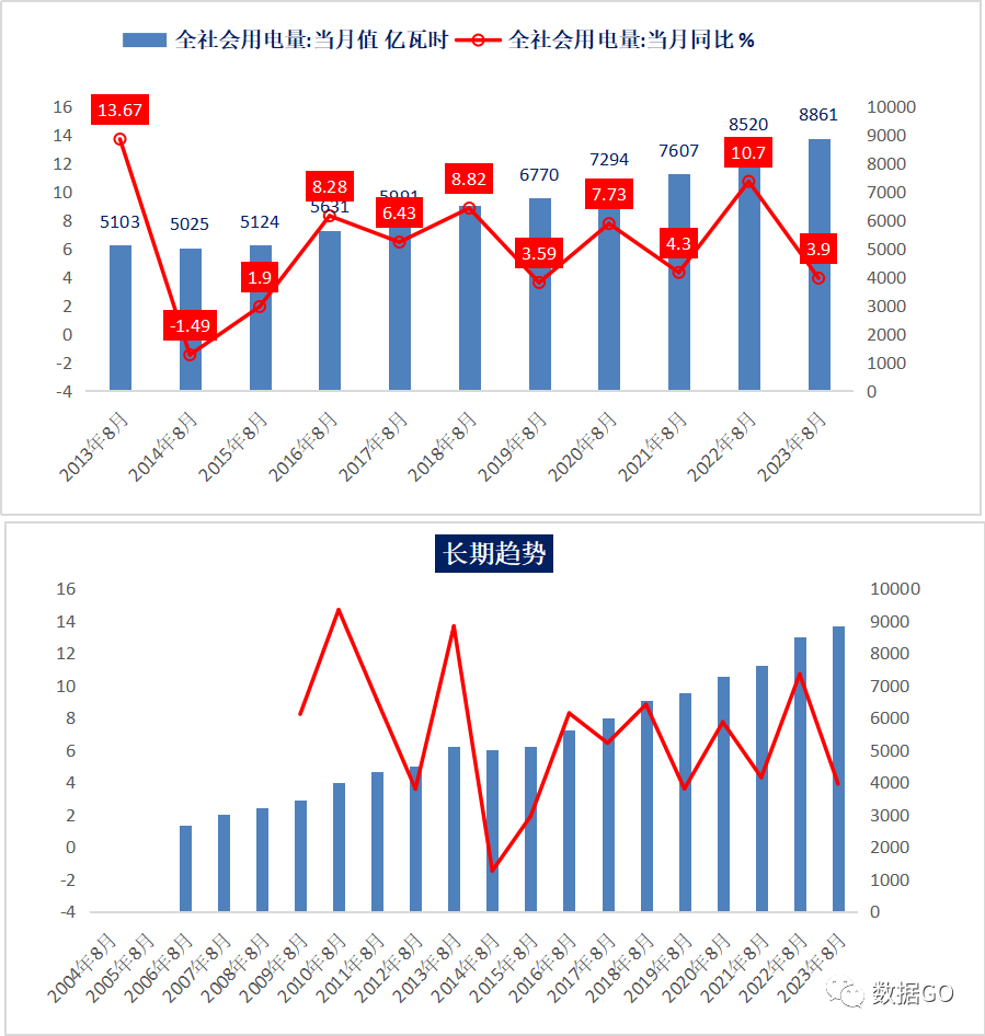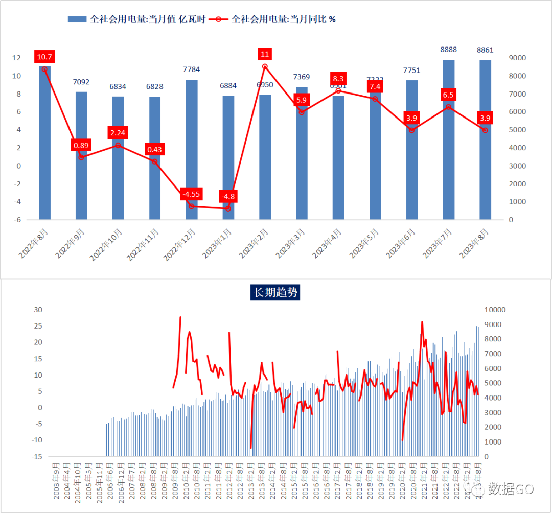 单月看,8月份,全社会用电量8861亿千瓦时,同比增长6.5%,增幅今年较低水平。
