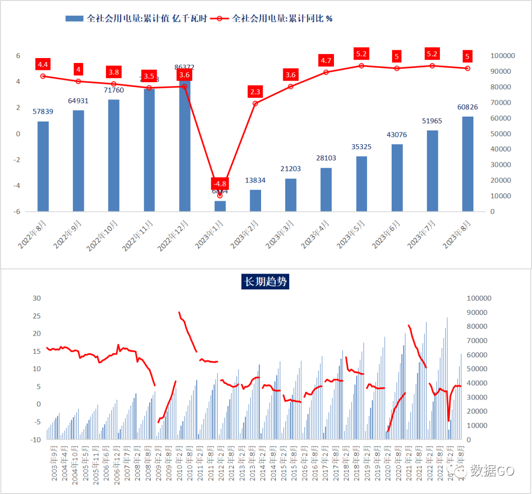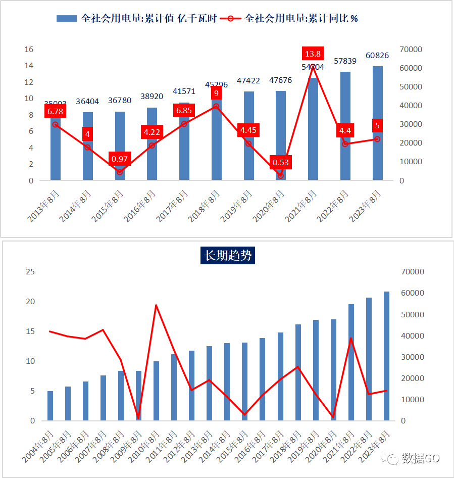 从历年前8月数据看,2023年前8月用电量绝对值创历史新高。