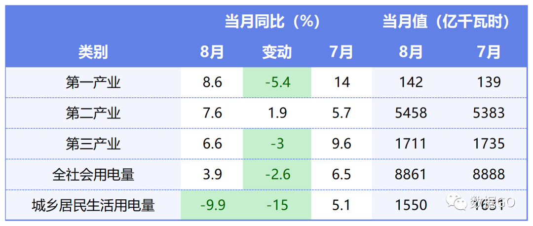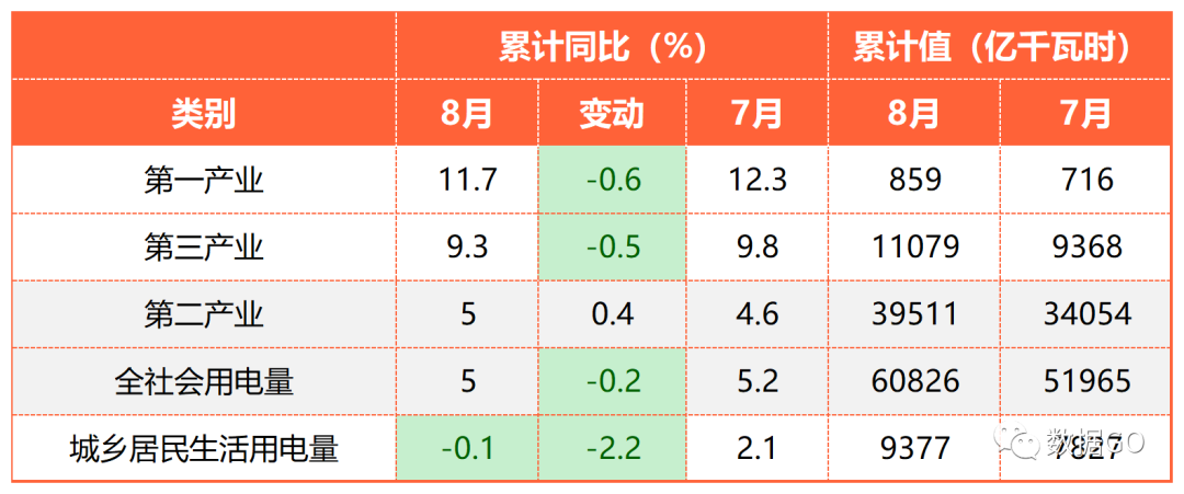 8月当月看,第一产业增幅最大,但是增幅比7月萎缩5.4各百分点;城乡居民生活用电量下降9.9%,增幅比7月大幅萎缩15个百分点。第二产业是唯一增幅扩大的项目,8月同比增幅达7.6%,增幅比7月扩大1.9个百分点。