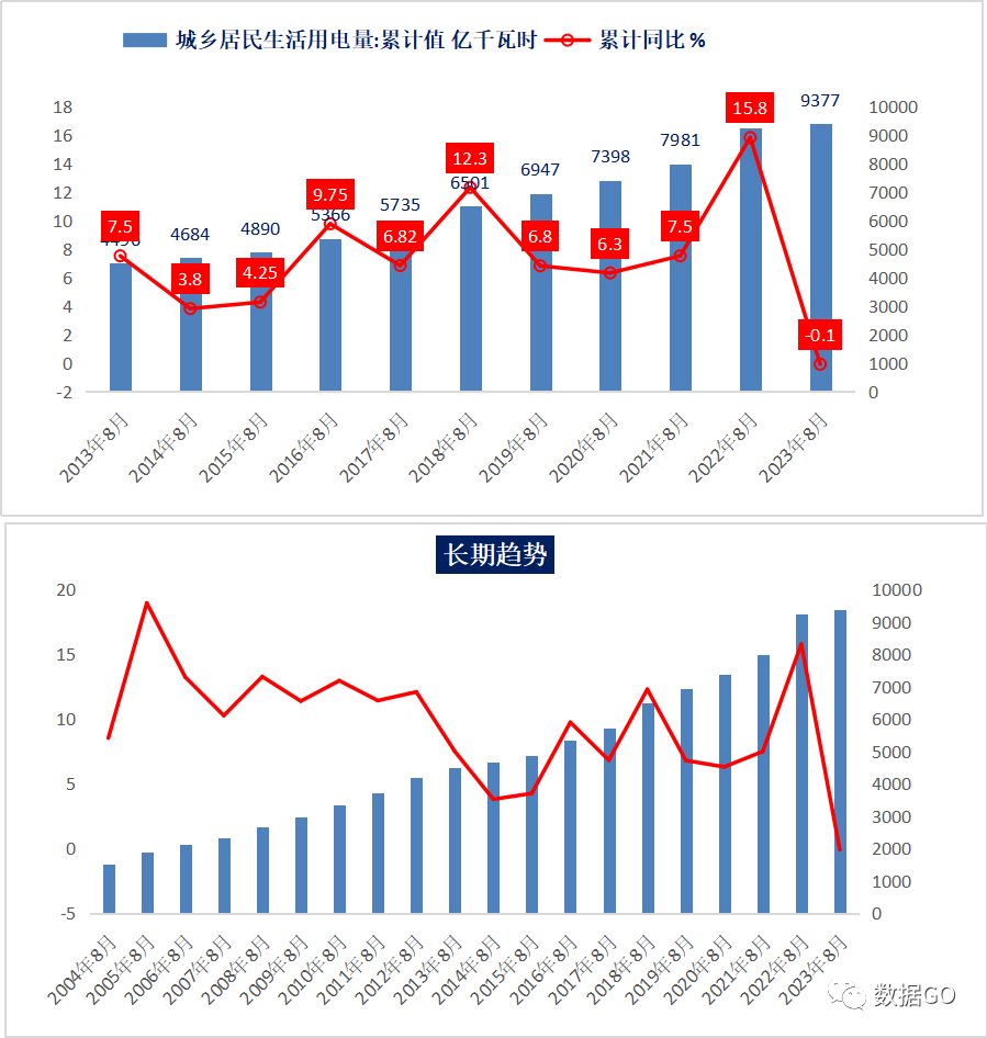 看下城乡居民生活用电量数据,前8月累计是9377亿千瓦时,官方公布是下降0.1%,但实际全年前8月公布的数据是9255亿千瓦时,低于今年千8月数据,因此-0.1%增幅不知道是如何得出。