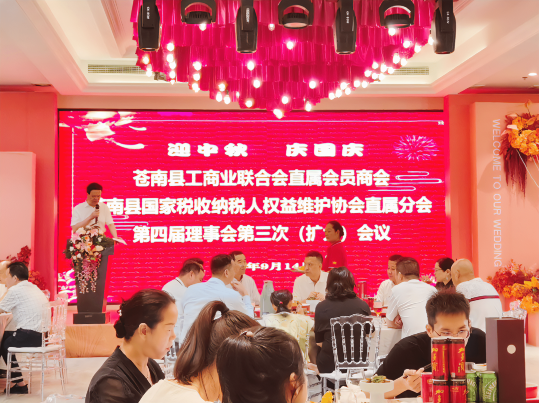 9月14日,苍南县工商业联合会直属会员商会、苍南县国家税收纳税人权益维护协会直属分会第四届理事会第三次(扩大)会议在万顺大酒店隆重召开。苍南县直属商会会长苏缪东,苍南县国家税收纳税人权益维护协会、县直属商会、县鞋革商会联合党支部书记赵加富,理事会领导班子成员及部分优秀会员代表出席会议。会议由赵加富主持。