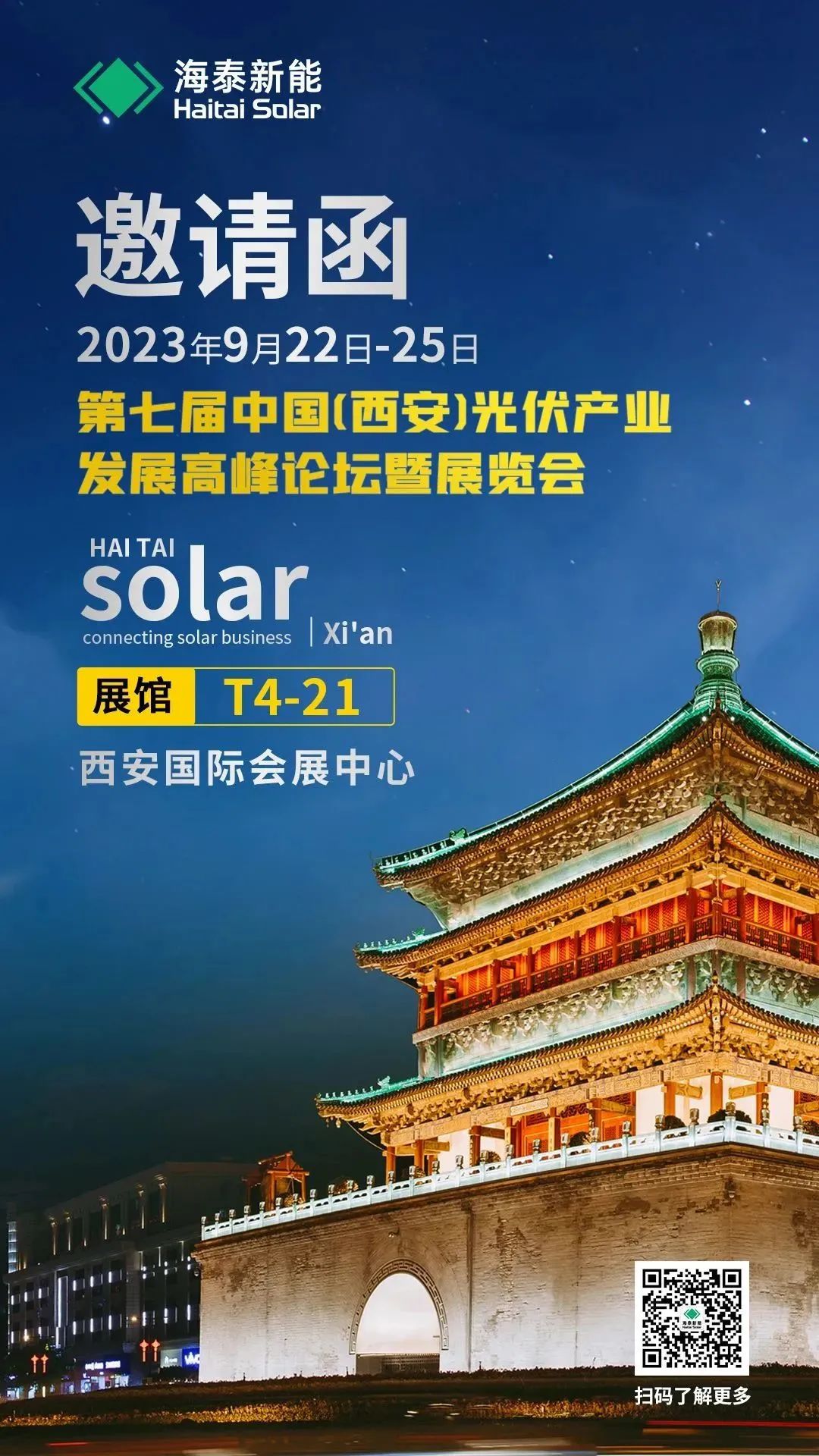 9月22日-25日,第七届中国(西安)光伏产业发展高峰论坛暨展览会(简称“西安光伏大会”)将在西安国际会展中心隆重举行。海泰新能将携神奇边框系列组件、N型TOPCon组件、210大尺寸组件等产品亮相T4展馆21展位,欢迎您的莅临!