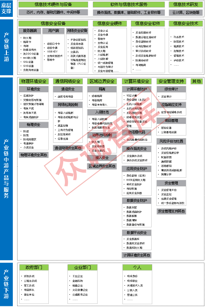 信息安全产业链大体上分为上中下游三大环节。其中,上游主要包括信息安全设备、硬件和软件的供应,如防火墙、网闸、动态口令卡、系统安全检测软件等,以及相关电子信息制造和基础软件的自主创新和自主可控,即俗称的信创产业相关领域。中游主要为信息安全产品生产与服务,主要包括6大类,即物理环境安全、通信网络安全、区域边界安全、计算环境安全、安全管理支持和其他。下游主要为应用领域,即信息安全产品应用和服务对象,如党政系统、公检法系统、军工系统、各类事业单位等政府部门,以及工业、能源、电信、金融、交通轨道、医疗、教育等企业部门和个人等。从下游需求来看,政府、电信和金融等涉及国家安全和国民经济命脉的行业是信息安全产品的主要需求对象,总占比接近65%。具体产业链图景详见图1、2、3所示。