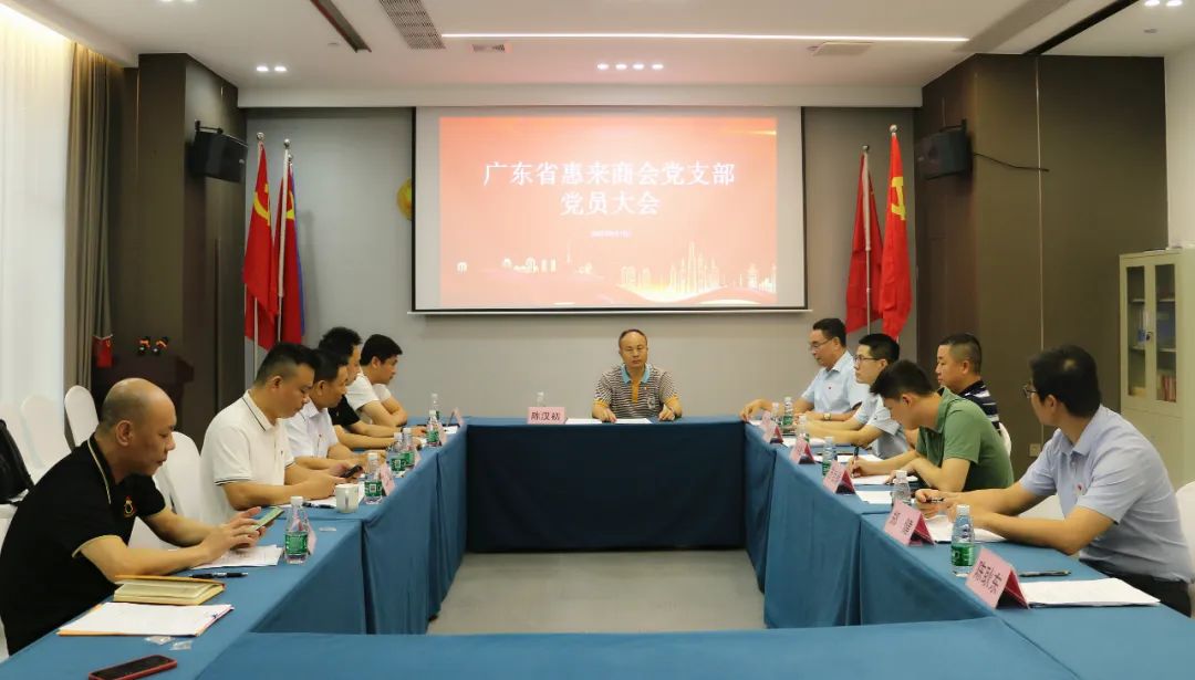 2023年9月13日下午,广东省惠来商会党支部,在商会党建活动室召开“广东省惠来商会第二届第一次党员大会”。陈汉初、黄庆奎、林彦贞、林焕松、方佳腾、郑健、吴汉雄、陈耿东8名支部正式党员出席会议。