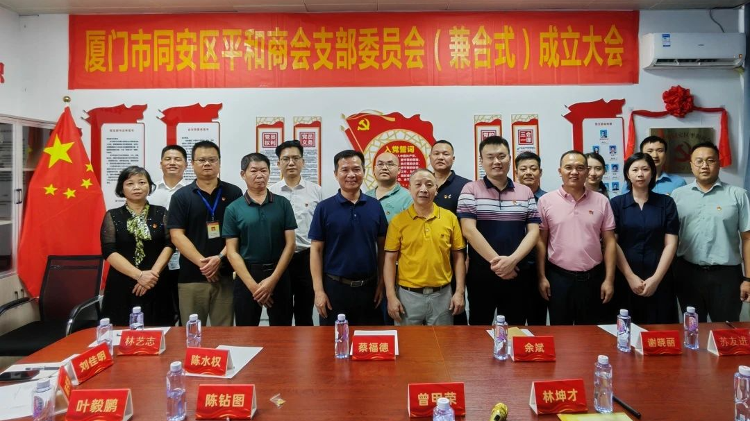 会议现场,工商联党组书记蔡福德、西柯街道党工委组织委员余斌,同安区平和商会会长曾甲荣、党支部书记林坤才共同为平和商会党支部揭牌。