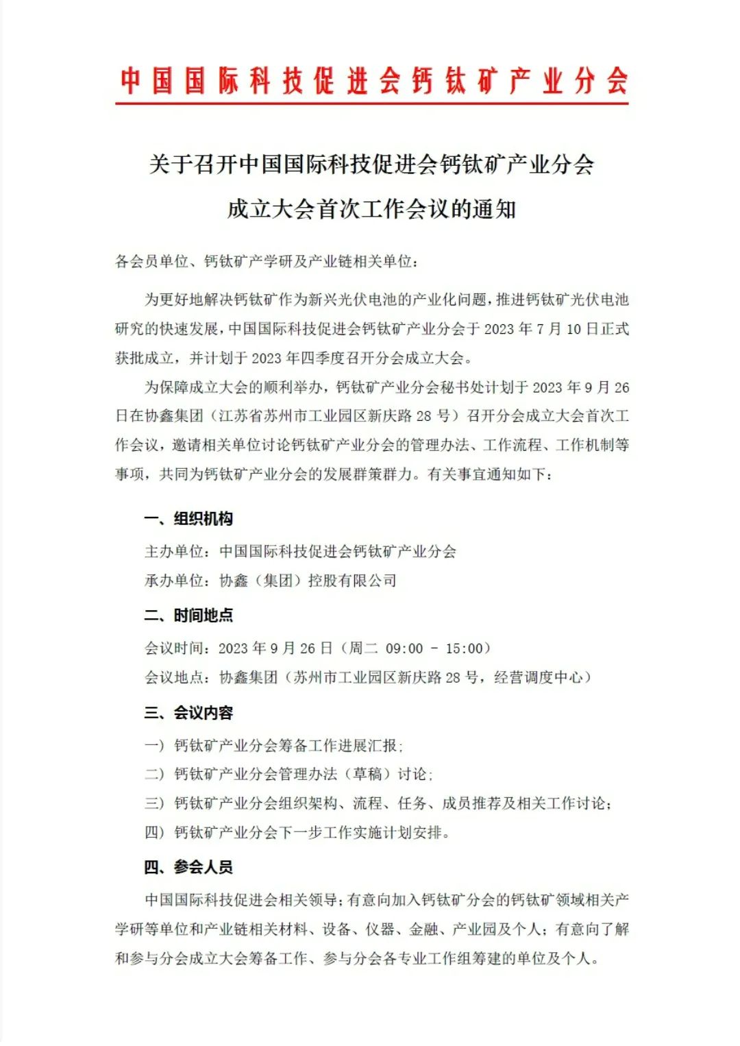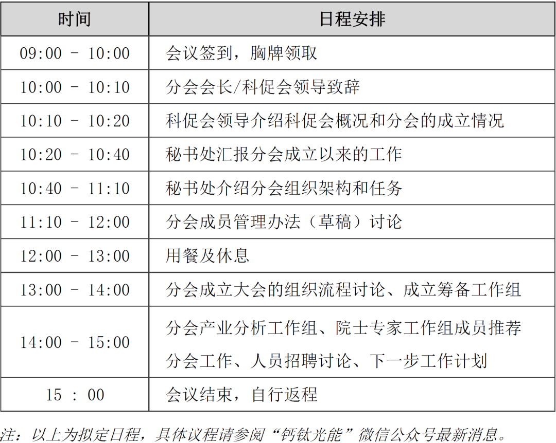 为保障成立大会的顺利举办,钙钛矿产业分会秘书处计划于2023年9月26日在协鑫集团(江苏省苏州市工业园区新庆路28号)召开分会成立大会首次工作会议,邀请相关单位讨论钙钛矿产业分会的管理办法、工作流程、工作机制等事项,共同为钙钛矿产业分会的发展群策群力。有关事宜通知如下: