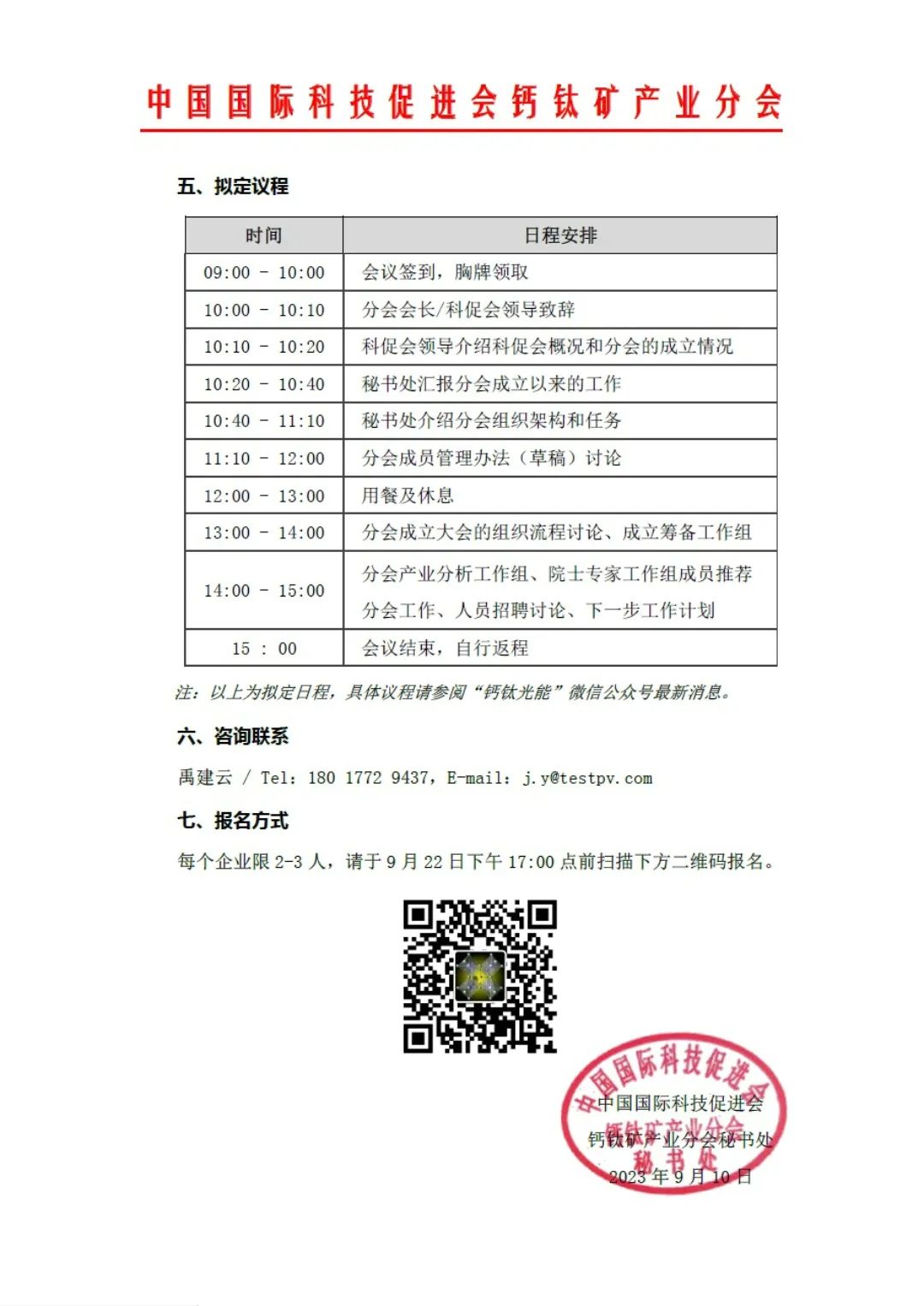 中国国际科技促进会 钙钛矿产业分会秘书处 2023年9月10日