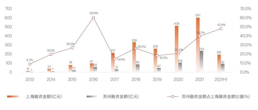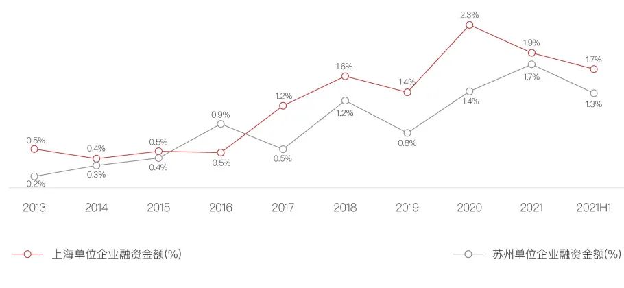 图:上海和苏州单位企业(生命科学赛道)融资金额对比